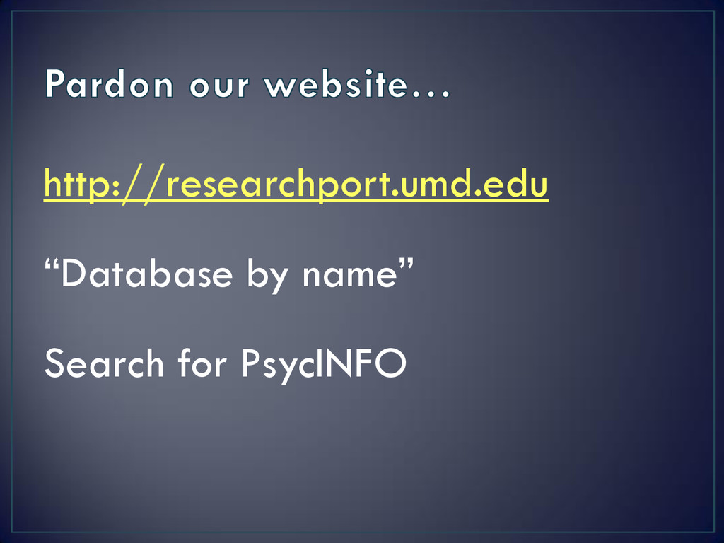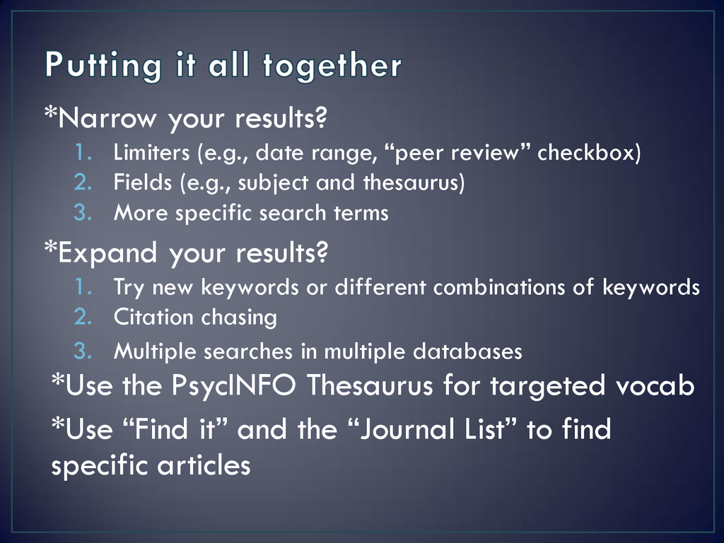 checkbox) 2. Fields (e.g., subject and thesaurus) 3. More specific search terms *Expand your results? 1. Try new keywords or different combinations of keywords 2. Citation chasing 3. Multiple searches in multiple databases *Use the PsycINFO Thesaurus for targeted vocab *Use “Find it” and the “Journal List” to find specific articles