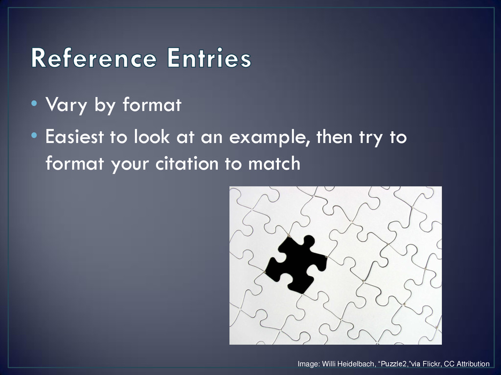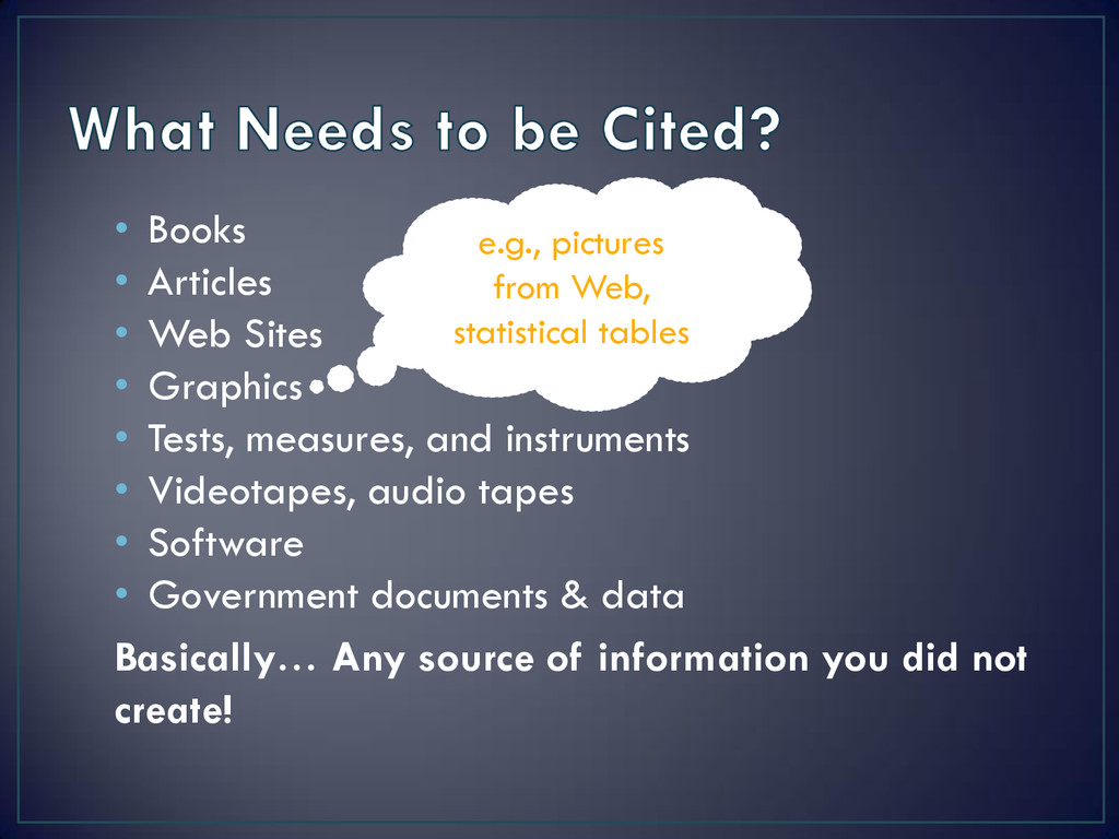 Tests, measures, and instruments • Videotapes, audio tapes • Software • Government documents & data Basically… Any source of information you did not create! e.g., pictures from Web, statistical tables