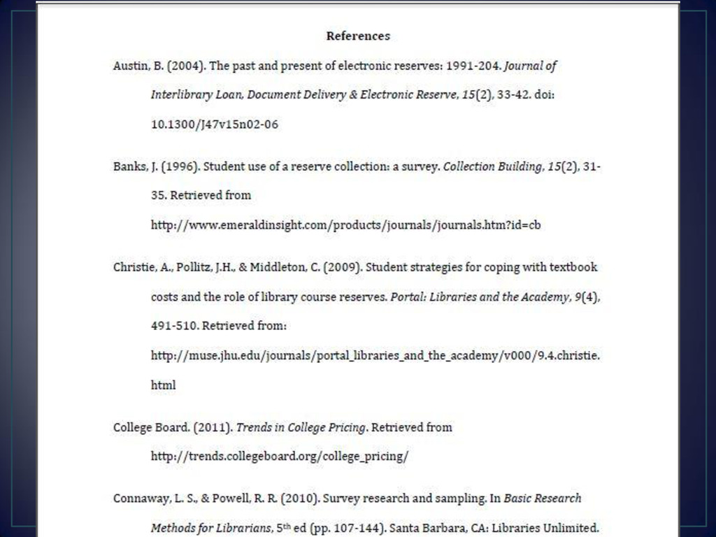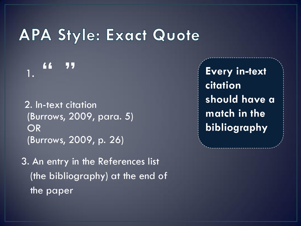 OR (Burrows, 2009, p. 26) 3. An entry in the References list (the bibliography) at the end of the paper Every in-text citation should have a match in the bibliography