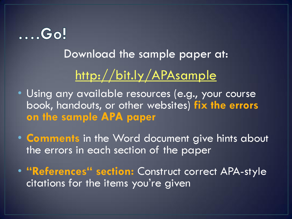 resources (e.g., your course book, handouts, or other websites) fix the errors on the sample APA paper • Comments in the Word document give hints about the errors in each section of the paper • “References“ section: Construct correct APA-style citations for the items you’re given