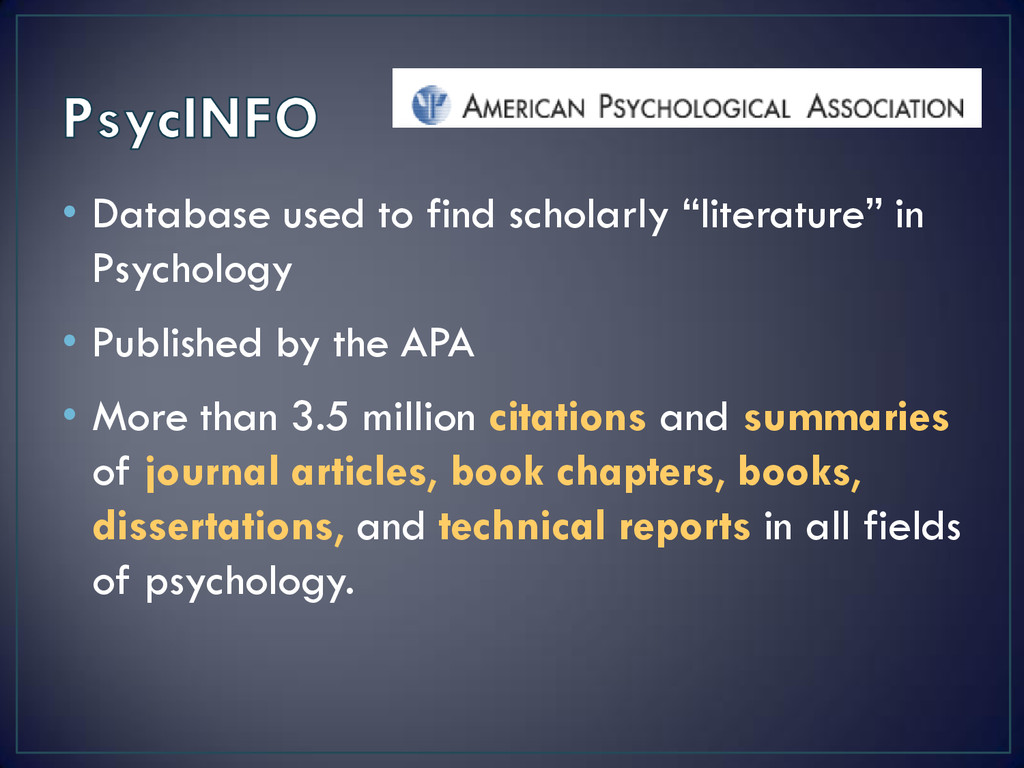 Published by the APA • More than 3.5 million citations and summaries of journal articles, book chapters, books, dissertations, and technical reports in all fields of psychology.