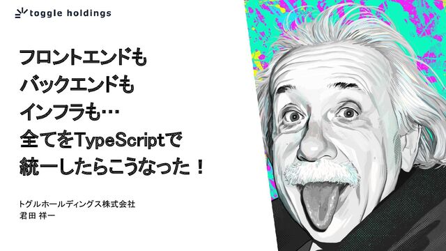本資料は、トグルホールディングス株式会社に許可なく複製・転載をしないようお願いします。 トグルホールディングス株式会社 君田 祥一 フロントエンドも バックエンドも インフラも… 全てをTypeScriptで 統一したらこうなった!
