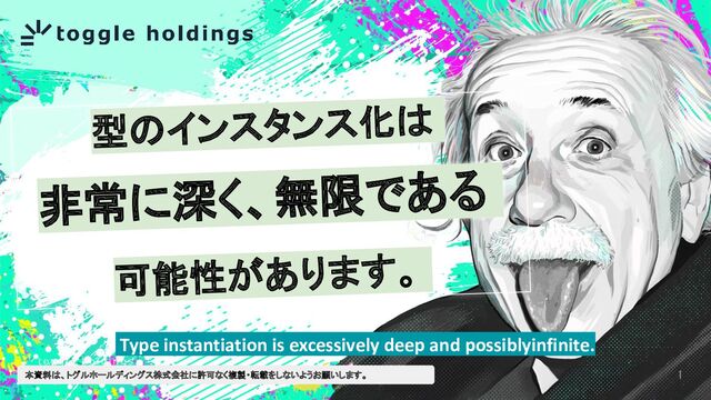 1 本資料は、トグルホールディングス株式会社に許可なく複製・転載をしないようお願いします。 型のインスタンス化は 非常に深く、無限である 可能性があります。 Type instantiation is excessively deep