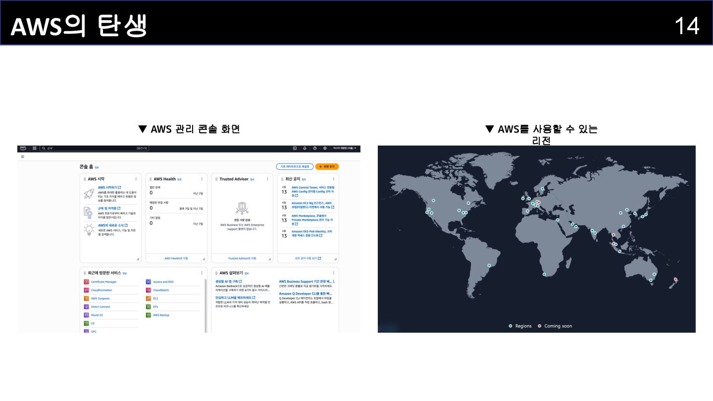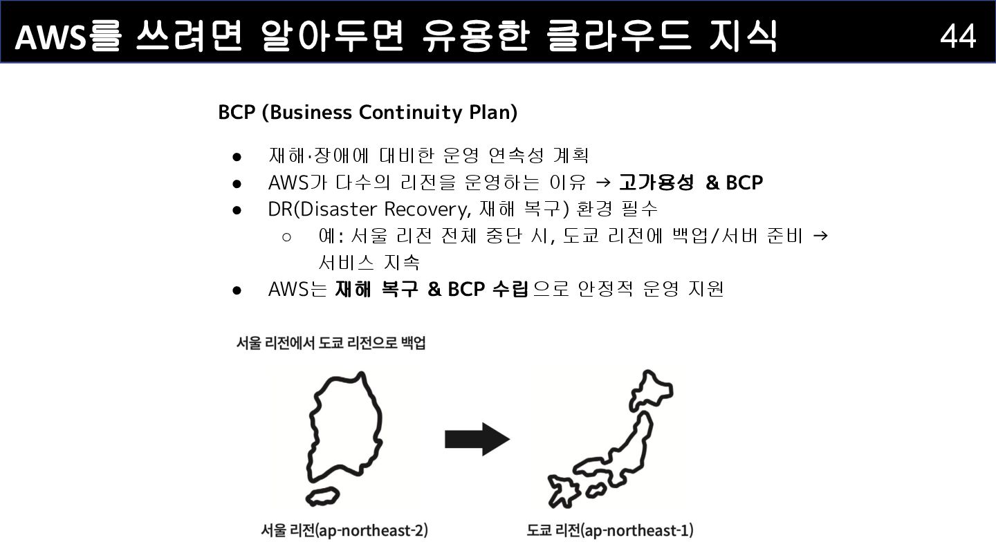 Plan) • 재해·장애에 대비한 운영 연속성 계획 • AWS가 다수의 리전을 운영하는 이유 → 고가용성 & BCP • DR(Disaster Recovery, 재해 복구) 환경 필수 ◦ 예: 서울 리전 전체 중단 시, 도쿄 리전에 백업/서버 준비 → 서비스 지속 • AWS는 재해 복구 & BCP 수립으로 안정적 운영 지원