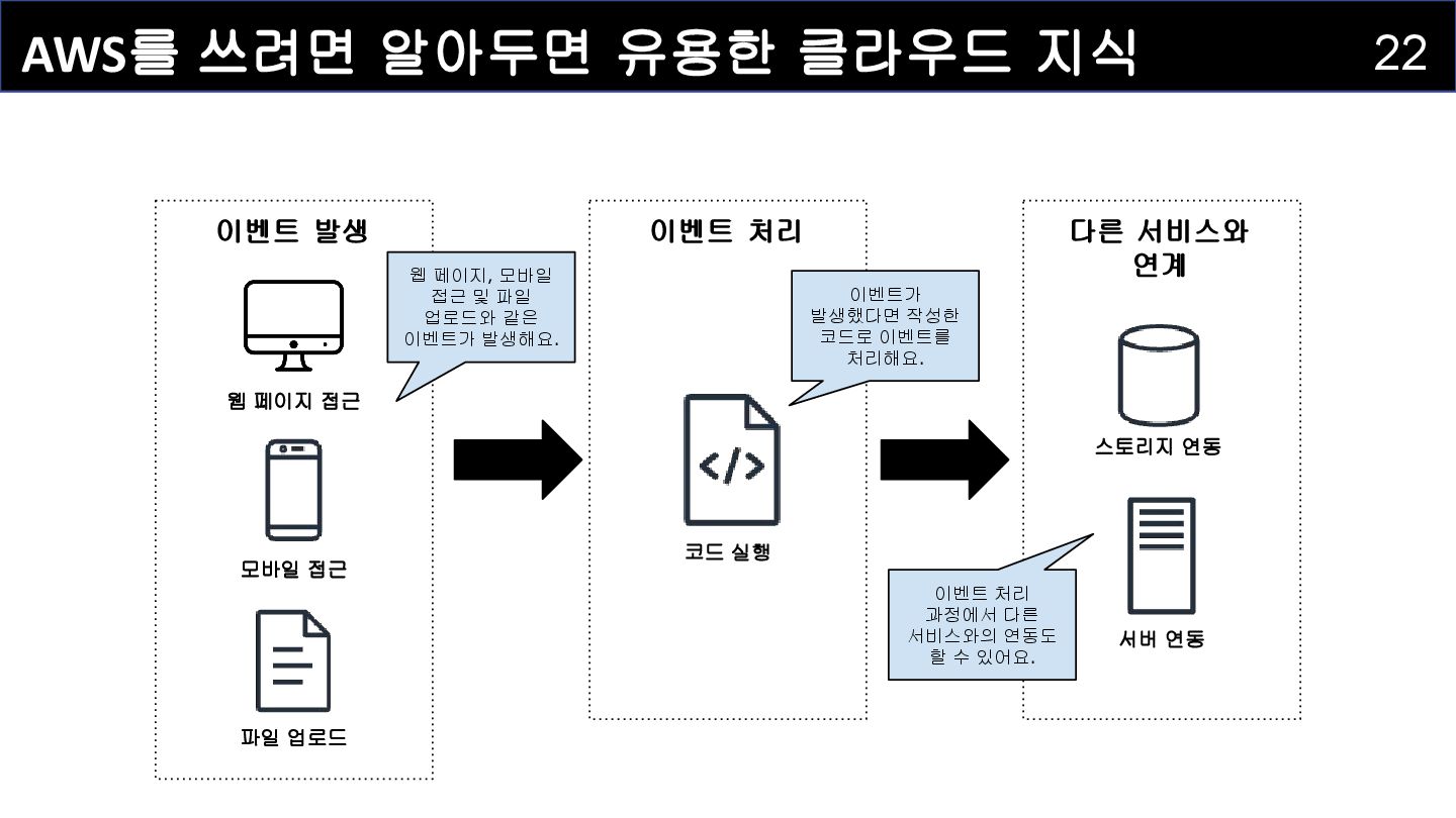 처리 다른 서비스와 연계 웹 페이지 접근 웹 페이지, 모바일 접근 및 파일 업로드와 같은 이벤트가 발생해요. 이벤트가 발생했다면 작성한 코드로 이벤트를 처리해요. 파일 업로드 모바일 접근 코드 실행 이벤트 처리 과정에서 다른 서비스와의 연동도 할 수 있어요. 서버 연동 스토리지 연동
