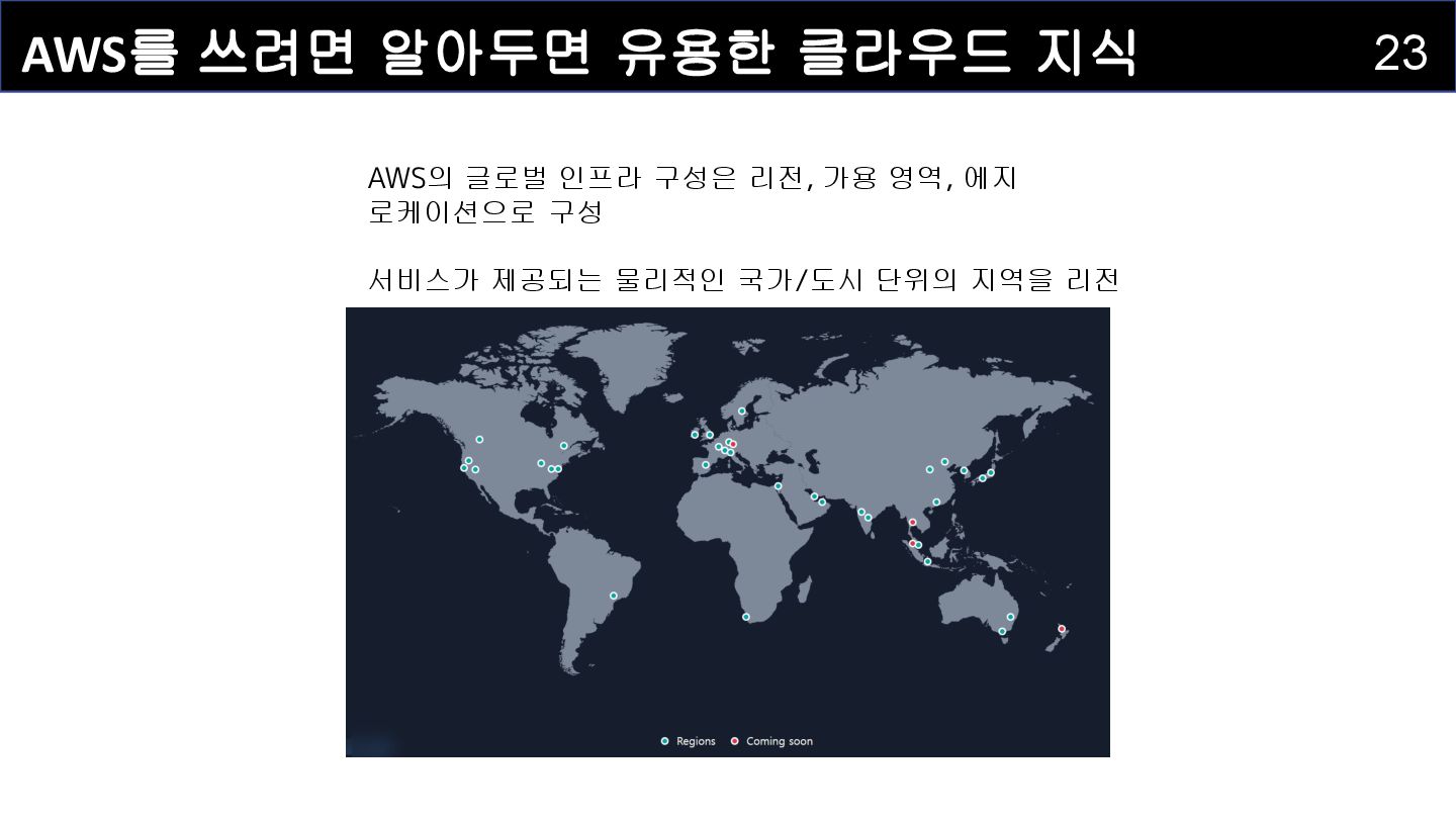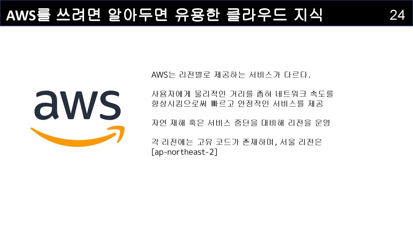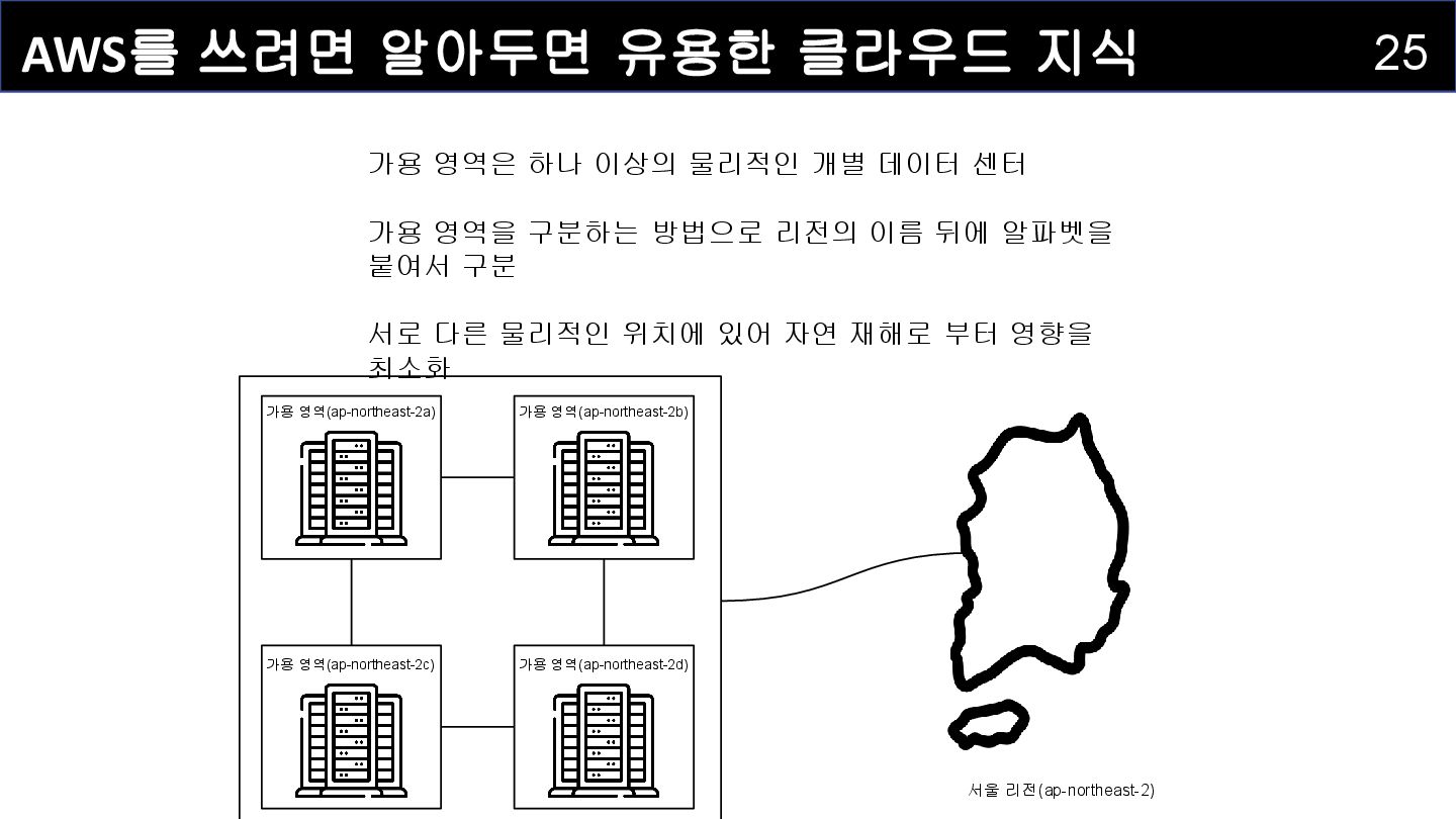 영역(ap-northeast-2c) 가용 영역(ap-northeast-2d) 가용 영역(ap-northeast-2a) 가용 영역(ap-northeast-2b) 가용 영역은 하나 이상의 물리적인 개별 데이터 센터 가용 영역을 구분하는 방법으로 리전의 이름 뒤에 알파벳을 붙여서 구분 서로 다른 물리적인 위치에 있어 자연 재해로 부터 영향을 최소화