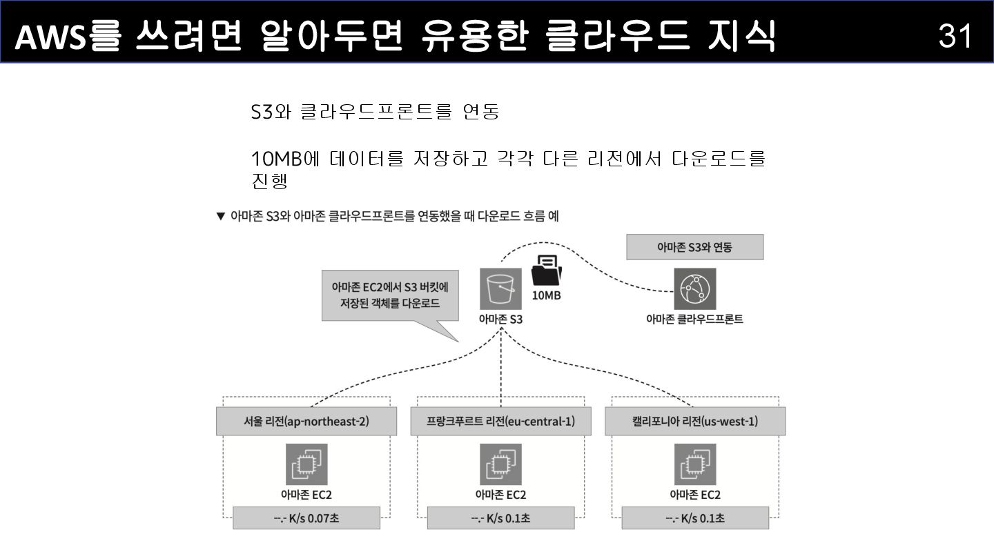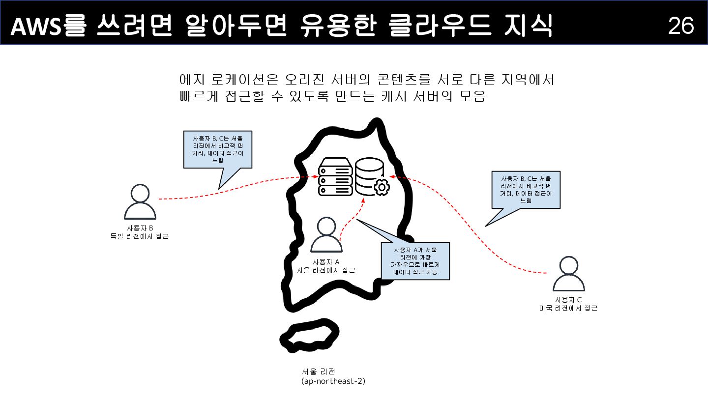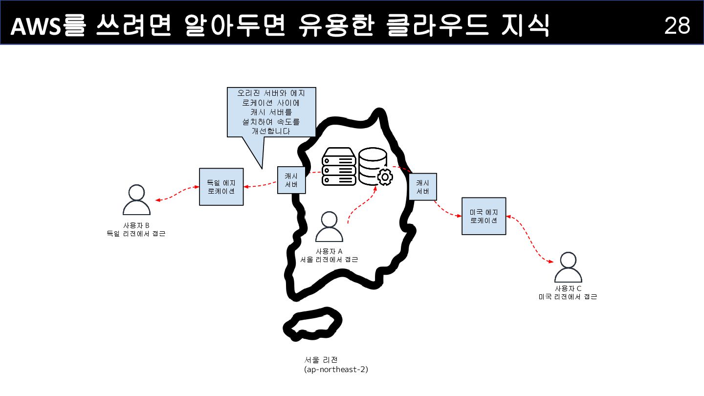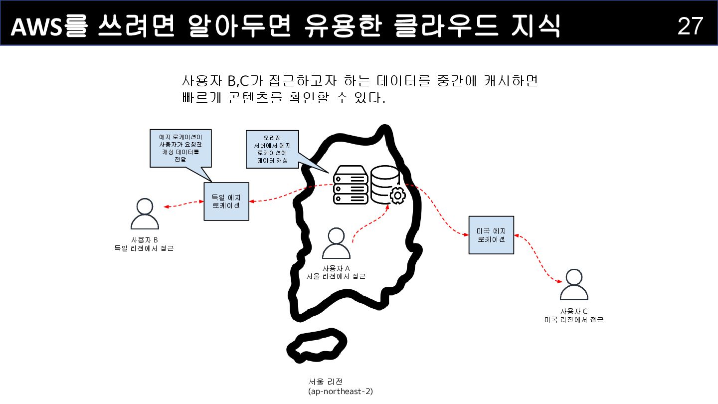 사용자 A 서울 리전에서 접근 사용자 B 독일 리전에서 접근 사용자 C 미국 리전에서 접근 독일 에지 로케이션 미국 에지 로케이션 오리진 서버에서 에지 로케이션에 데이터 캐싱 사용자 B,C가 접근하고자 하는 데이터를 중간에 캐시하면 빠르게 콘텐츠를 확인할 수 있다. 에지 로케이션이 사용자가 요청한 캐싱 데이터를 전달