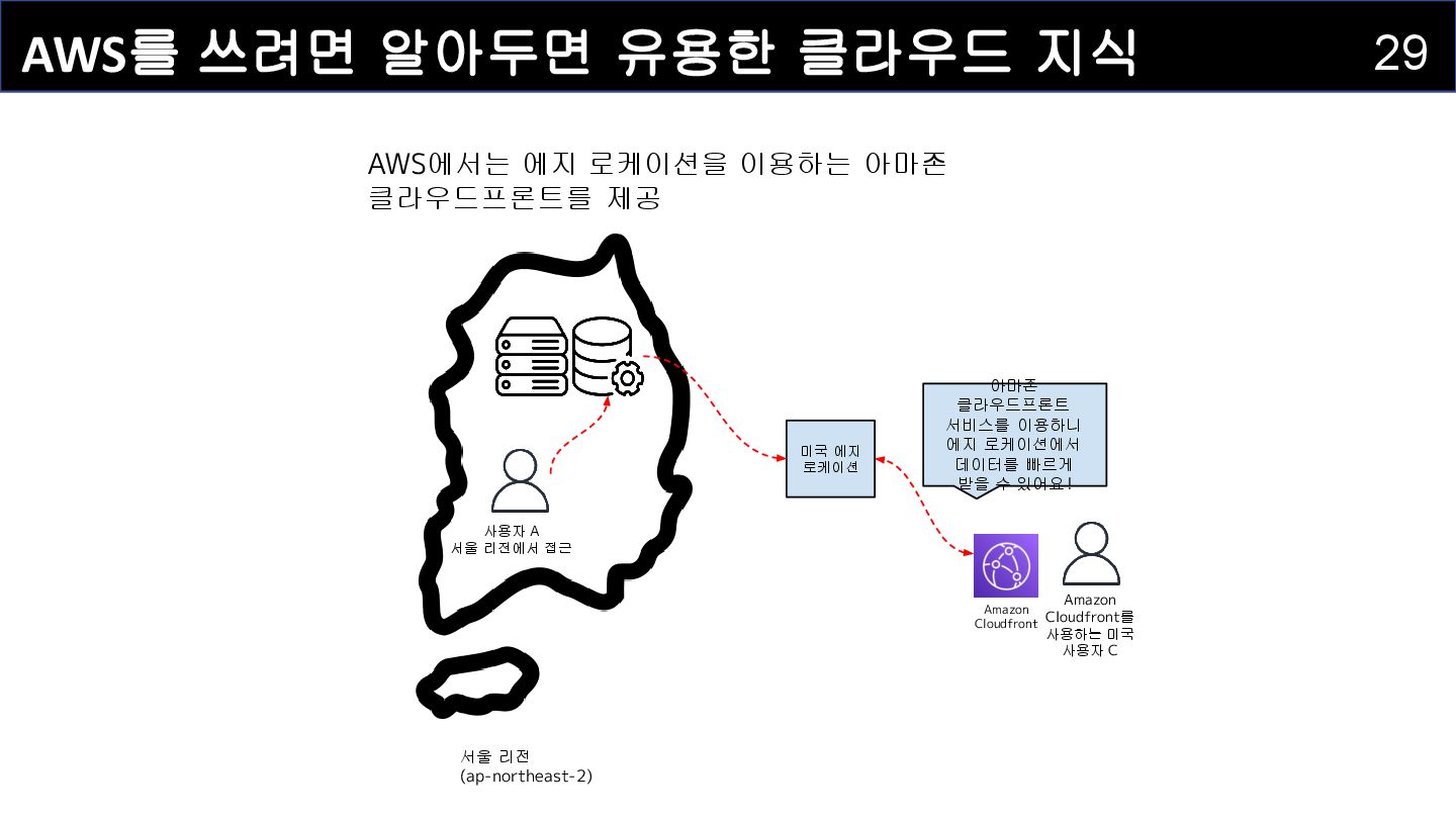 사용자 A 서울 리전에서 접근 Amazon Cloudfront를 사용하는 미국 사용자 C 미국 에지 로케이션 Amazon Cloudfront 아마존 클라우드프론트 서비스를 이용하니 에지 로케이션에서 데이터를 빠르게 받을 수 있어요! AWS에서는 에지 로케이션을 이용하는 아마존 클라우드프론트를 제공