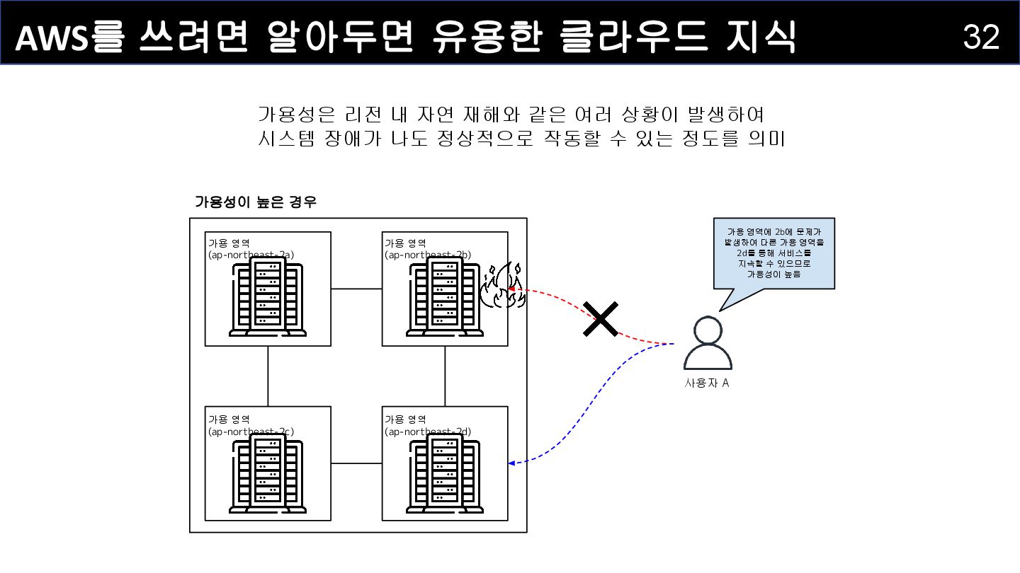 영역에 2b에 문제가 발생하여 다른 가용 영역을 2d를 통해 서비스를 지속할 수 있으므로 가용성이 높음 가용 영역 (ap-northeast-2c) 가용 영역 (ap-northeast-2d) 가용 영역 (ap-northeast-2a) 가용 영역 (ap-northeast-2b) 가용성이 높은 경우 가용성은 리전 내 자연 재해와 같은 여러 상황이 발생하여 시스템 장애가 나도 정상적으로 작동할 수 있는 정도를 의미