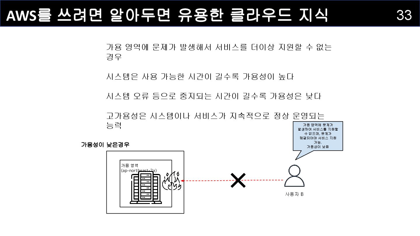 발생해서 서비스를 더이상 지원할 수 없는 경우 시스템은 사용 가능한 시간이 길수록 가용성이 높다 시스템 오류 등으로 중지되는 시간이 길수록 가용성은 낮다 고가용성은 시스템이나 서비스가 지속적으로 정상 운영되는 능력 사용자 B 가용 영역에 문제가 발생하여 서비스를 지원할 수 없으며, 문제가 해결되어야 서비스 지원 가능. 가용성이 낮음 가용 영역 (ap-northeast-2a) 가용성이 낮은경우