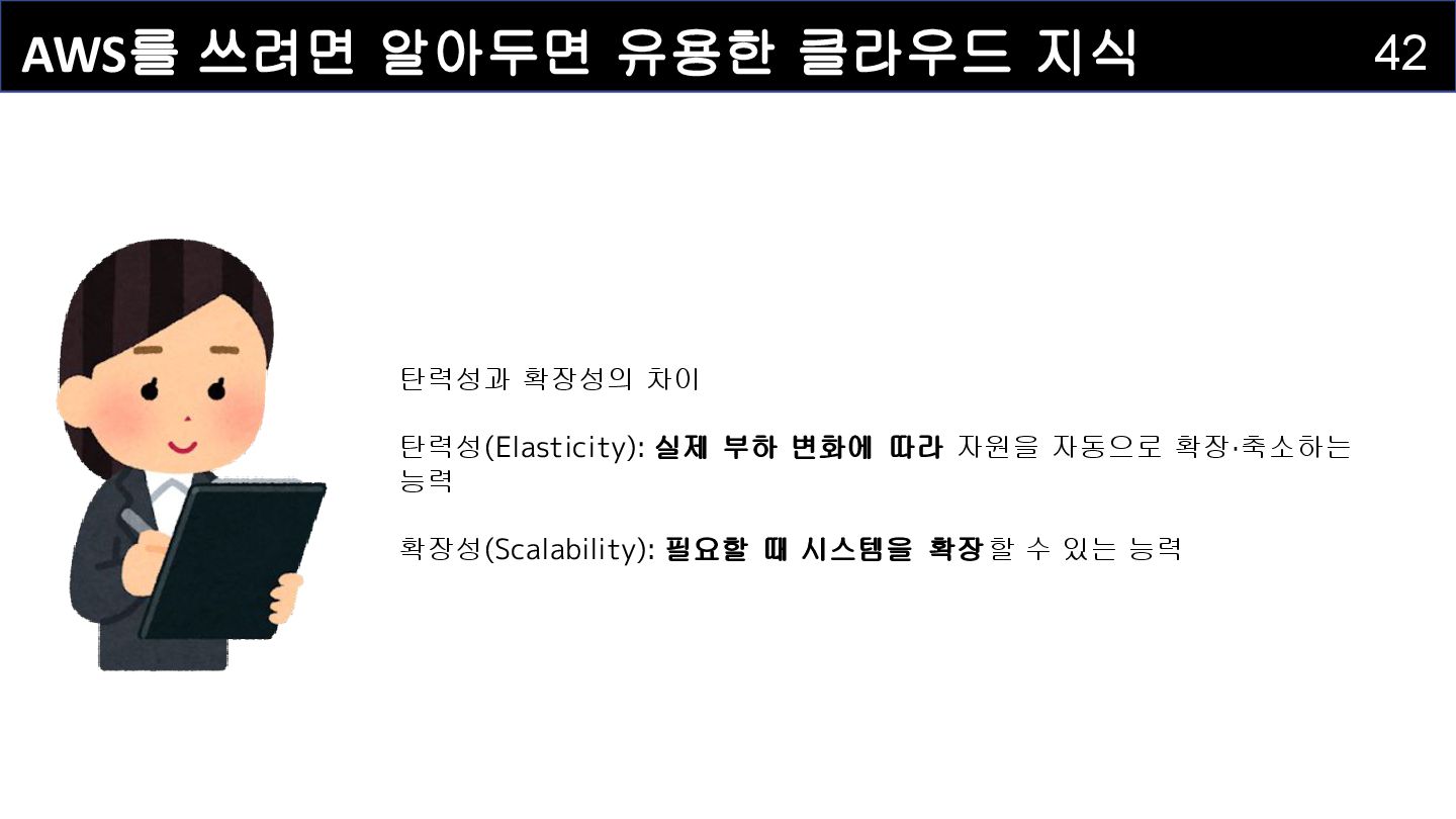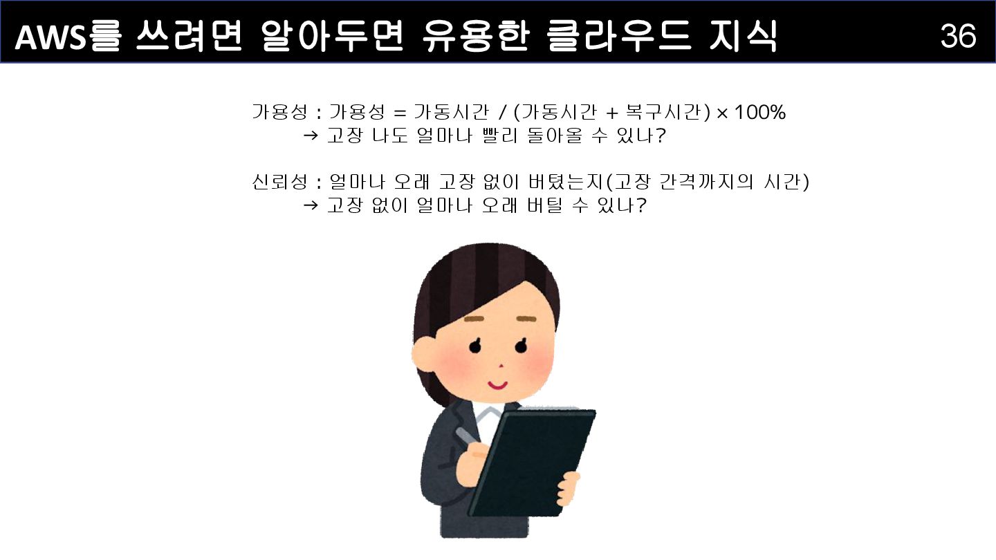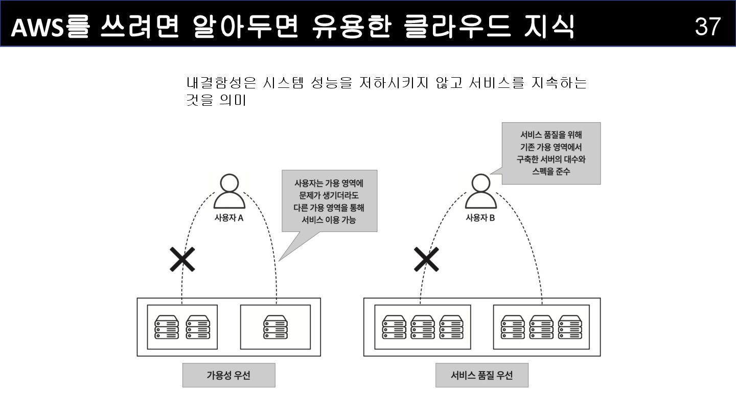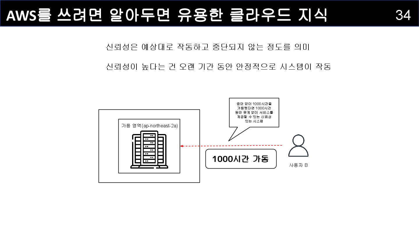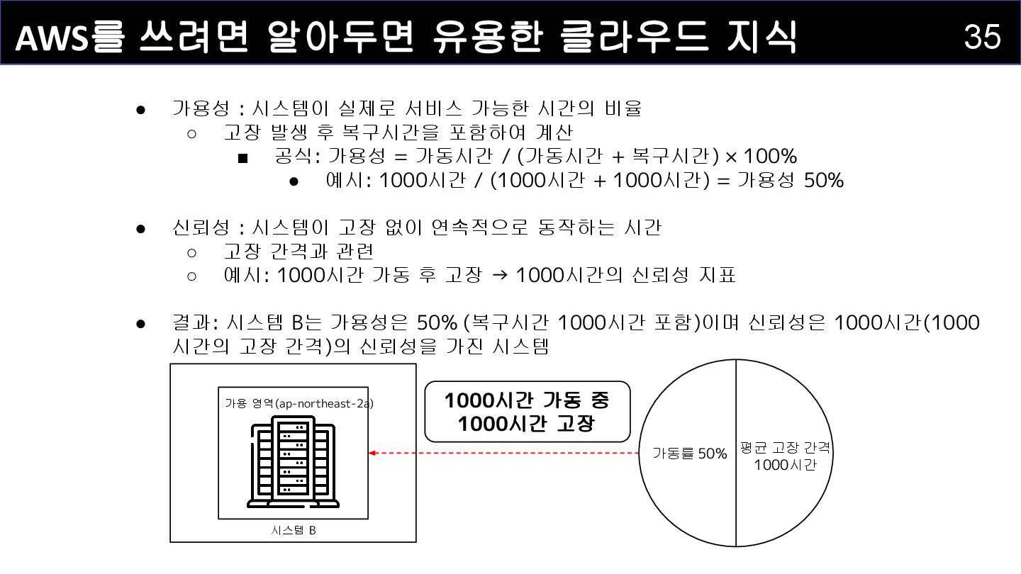 1000시간 고장 평균 고장 간격 1000시간 가동률 50% 가용 영역(ap-northeast-2a) 시스템 B • 가용성 : 시스템이 실제로 서비스 가능한 시간의 비율 ◦ 고장 발생 후 복구시간을 포함하여 계산 ▪ 공식: 가용성 = 가동시간 / (가동시간 + 복구시간) × 100% • 예시: 1000시간 / (1000시간 + 1000시간) = 가용성 50% • 신뢰성 : 시스템이 고장 없이 연속적으로 동작하는 시간 ◦ 고장 간격과 관련 ◦ 예시: 1000시간 가동 후 고장 → 1000시간의 신뢰성 지표 • 결과: 시스템 B는 가용성은 50% (복구시간 1000시간 포함)이며 신뢰성은 1000시간(1000 시간의 고장 간격)의 신뢰성을 가진 시스템