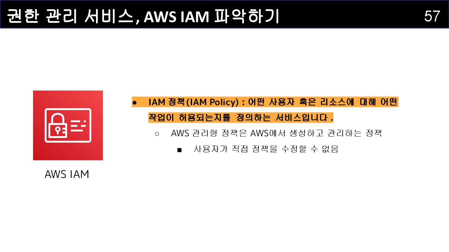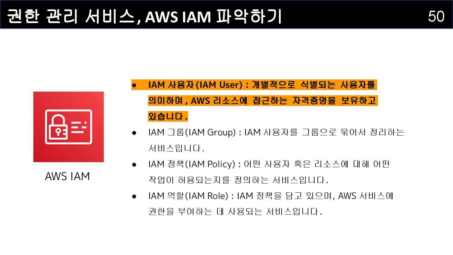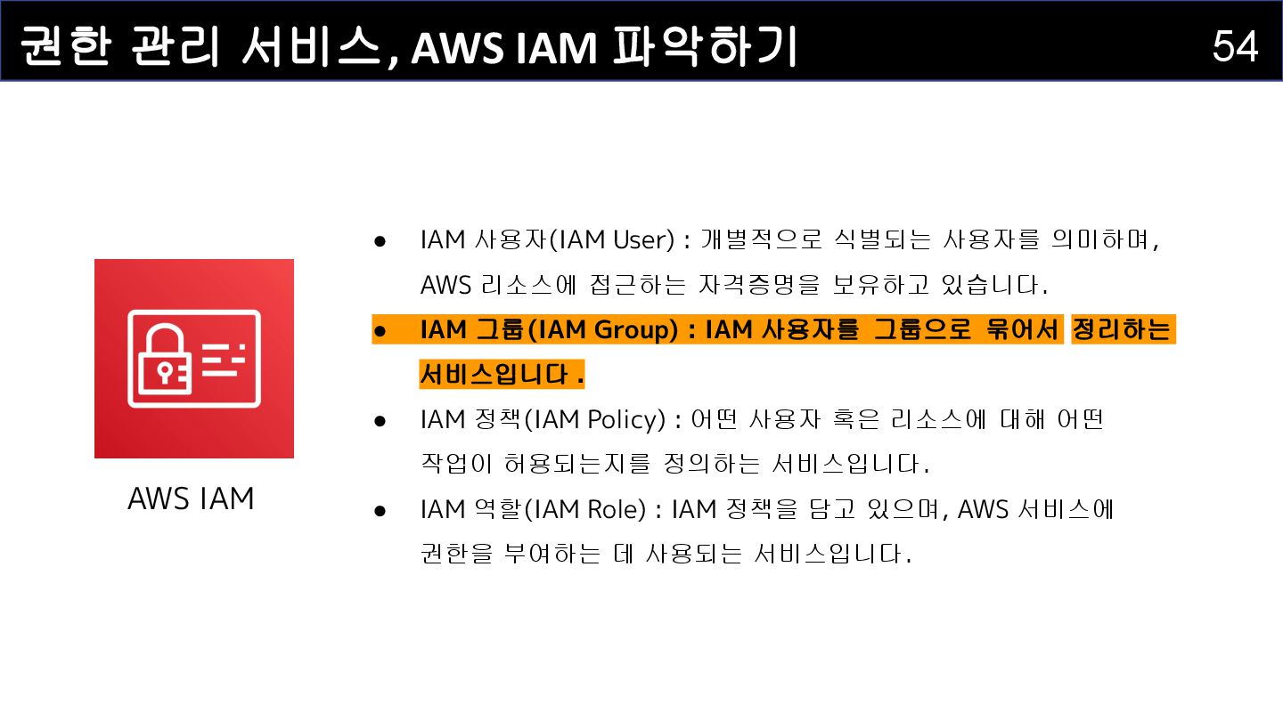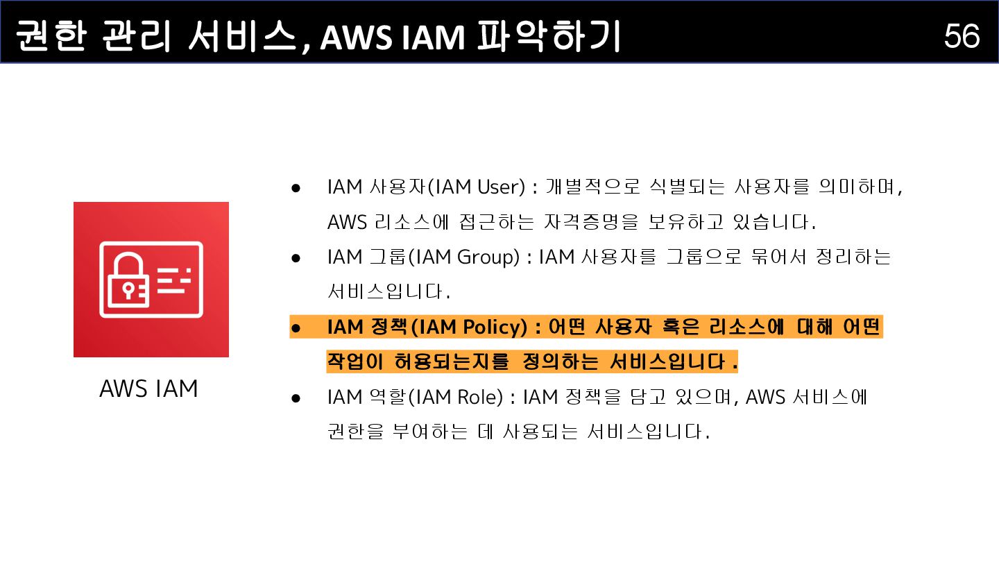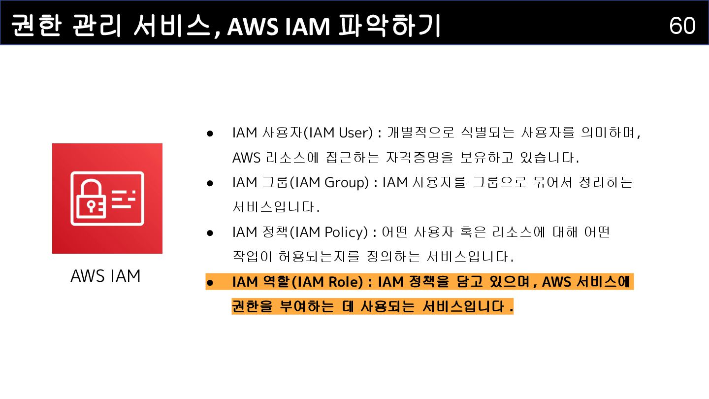 IAM 사용자(IAM User) : 개별적으로 식별되는 사용자를 의미하며 , AWS 리소스에 접근하는 자격증명을 보유하고 있습니다 . • IAM 그룹(IAM Group) : IAM 사용자를 그룹으로 묶어서 정리하는 서비스입니다. • IAM 정책(IAM Policy) : 어떤 사용자 혹은 리소스에 대해 어떤 작업이 허용되는지를 정의하는 서비스입니다. • IAM 역할(IAM Role) : IAM 정책을 담고 있으며, AWS 서비스에 권한을 부여하는 데 사용되는 서비스입니다.