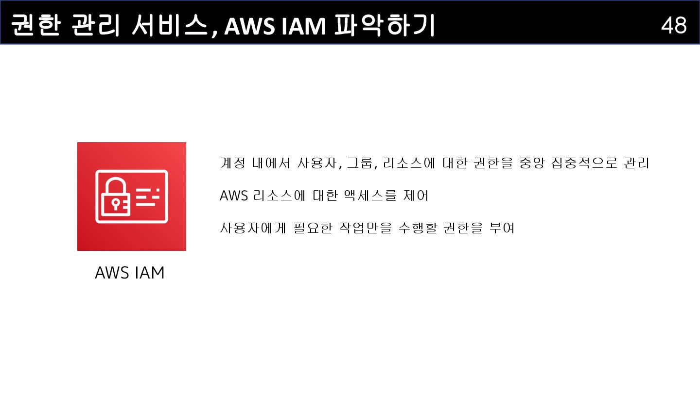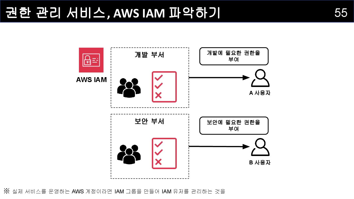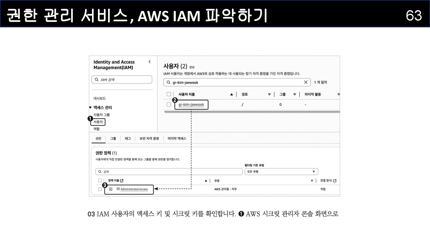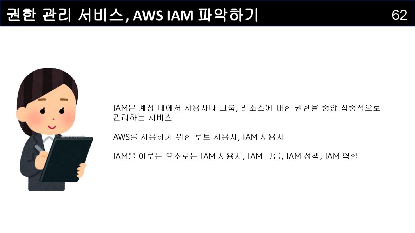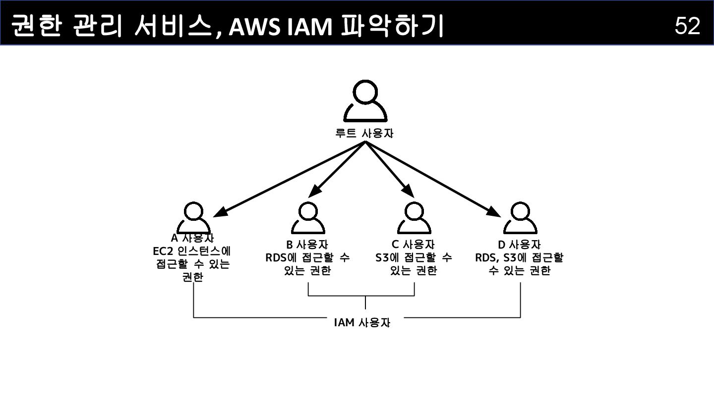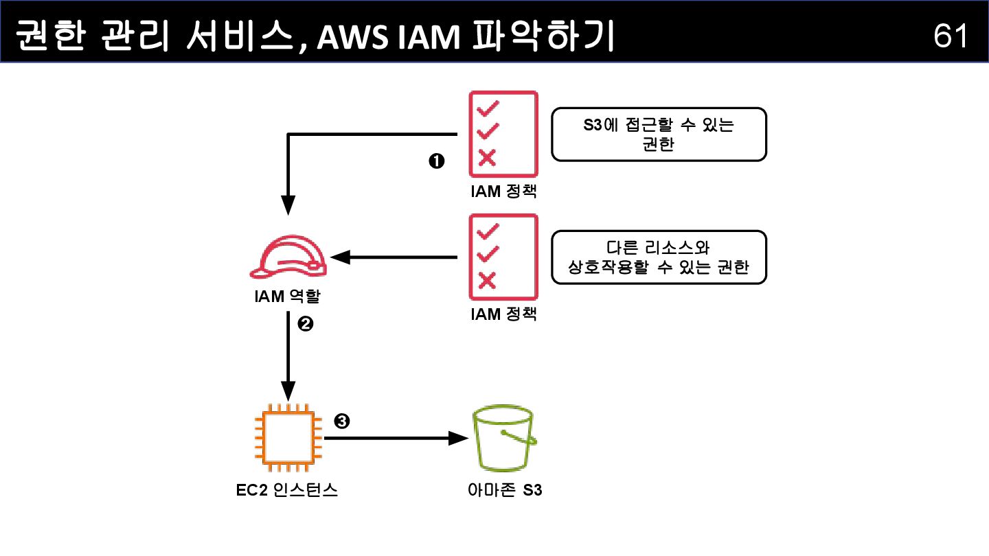 IAM 사용자(IAM User) : 개별적으로 식별되는 사용자를 의미하며 , AWS 리소스에 접근하는 자격증명을 보유하고 있습니다 . • IAM 그룹(IAM Group) : IAM 사용자를 그룹으로 묶어서 정리하는 서비스입니다. • IAM 정책(IAM Policy) : 어떤 사용자 혹은 리소스에 대해 어떤 작업이 허용되는지를 정의하는 서비스입니다. • IAM 역할(IAM Role) : IAM 정책을 담고 있으며, AWS 서비스에 권한을 부여하는 데 사용되는 서비스입니다.