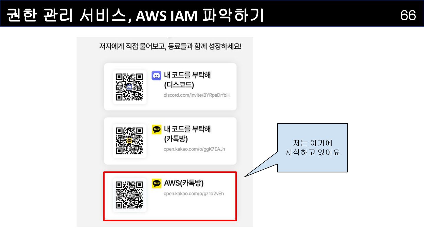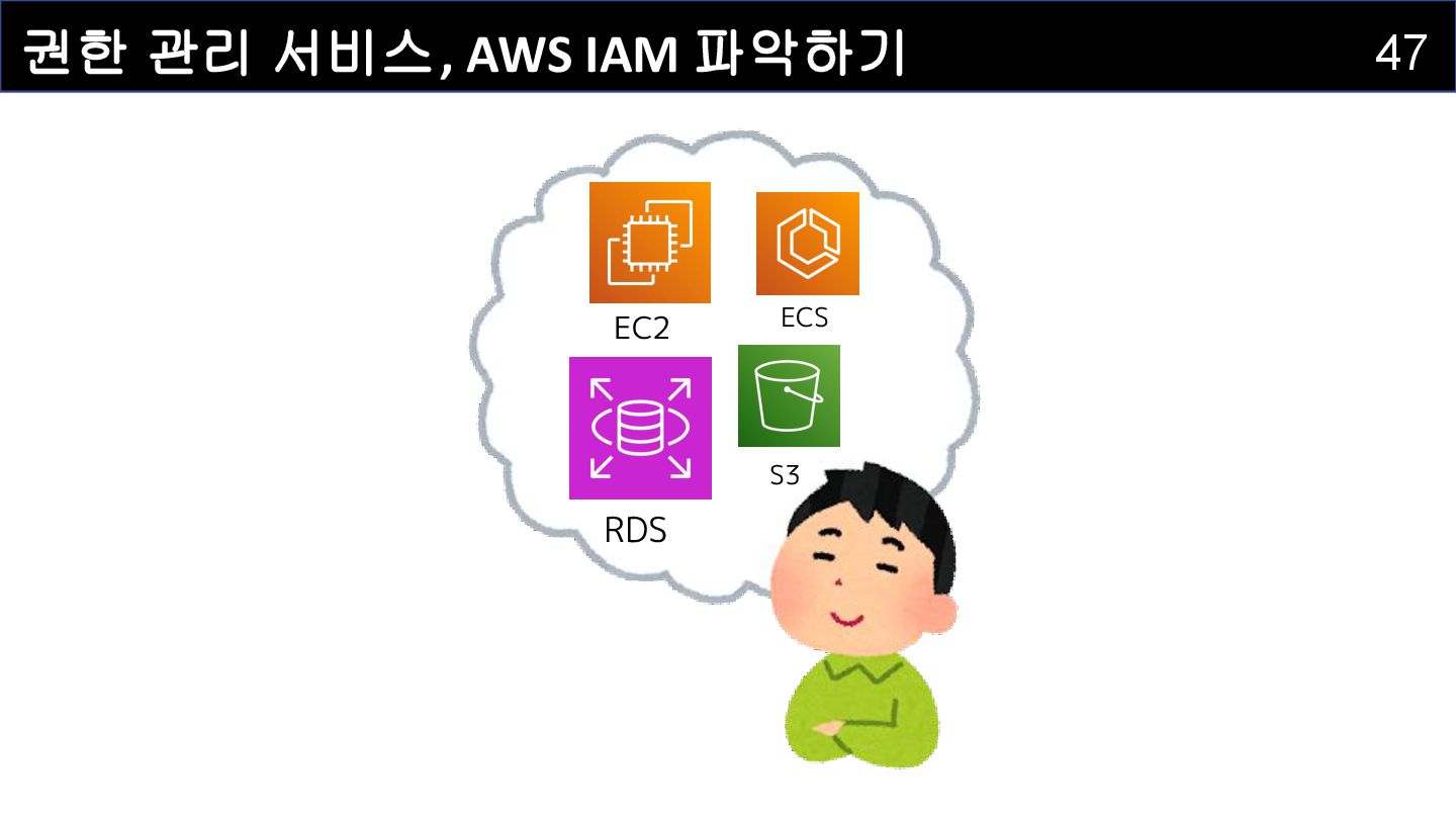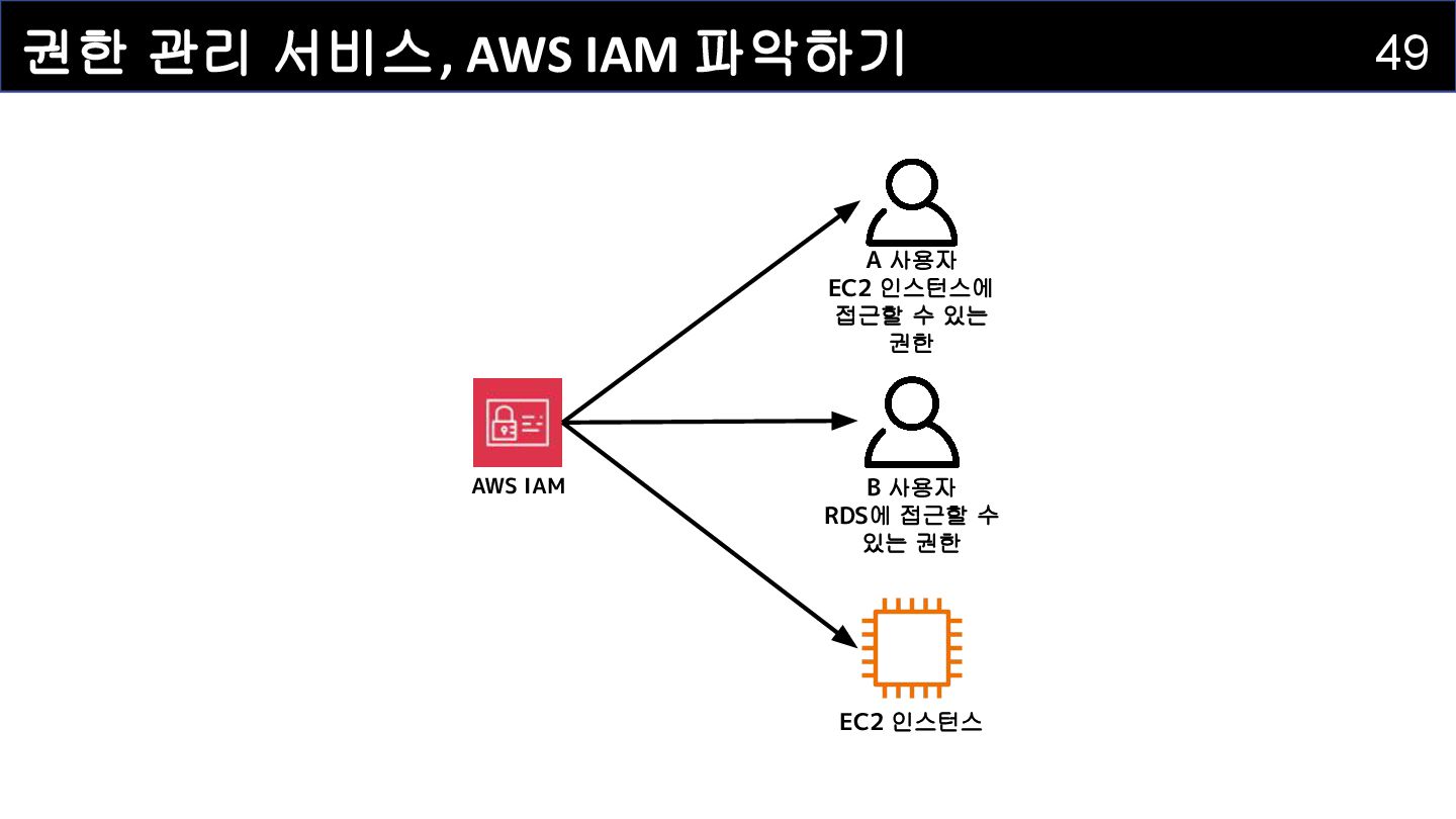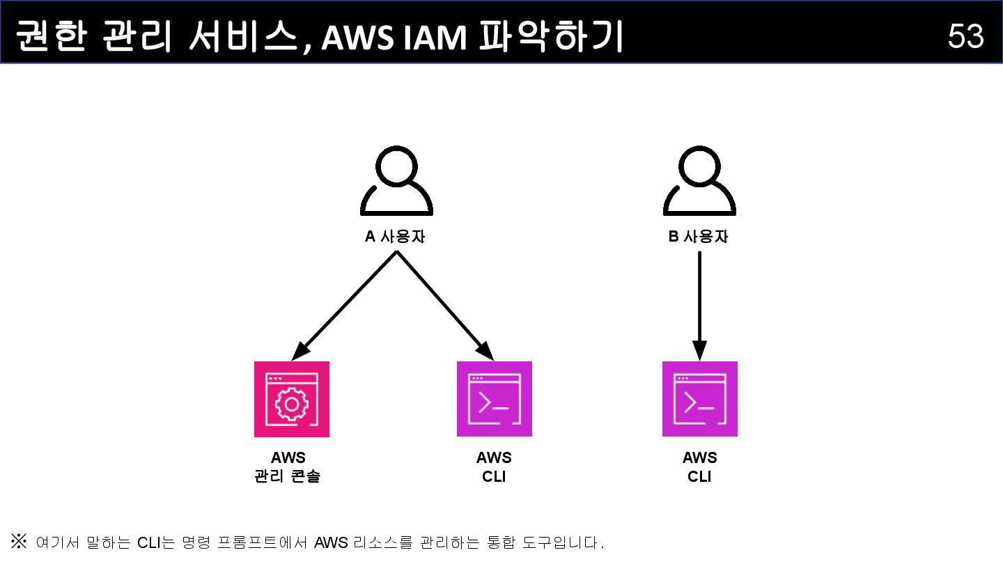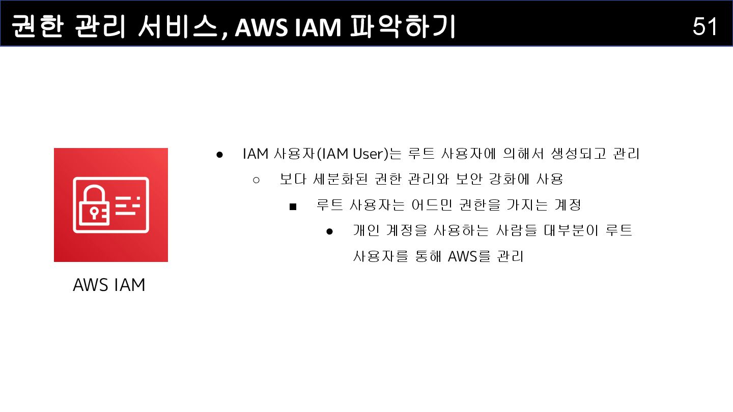 IAM 사용자(IAM User) : 개별적으로 식별되는 사용자를 의미하며 , AWS 리소스에 접근하는 자격증명을 보유하고 있습니다 . • IAM 그룹(IAM Group) : IAM 사용자를 그룹으로 묶어서 정리하는 서비스입니다. • IAM 정책(IAM Policy) : 어떤 사용자 혹은 리소스에 대해 어떤 작업이 허용되는지를 정의하는 서비스입니다. • IAM 역할(IAM Role) : IAM 정책을 담고 있으며, AWS 서비스에 권한을 부여하는 데 사용되는 서비스입니다.