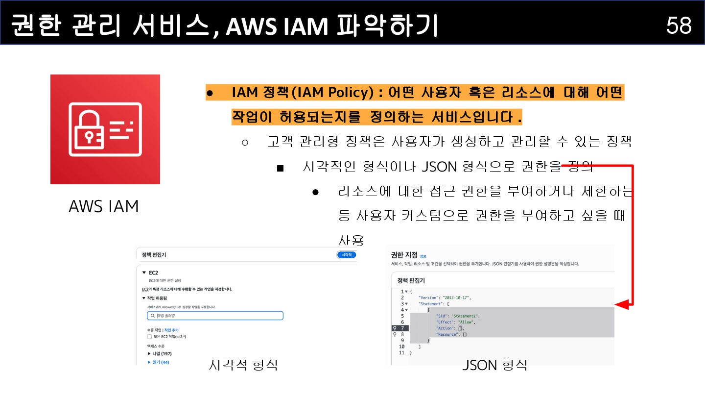 Policy) : 어떤 사용자 혹은 리소스에 대해 어떤 작업이 허용되는지를 정의하는 서비스입니다 . ◦ 고객 관리형 정책은 사용자가 생성하고 관리할 수 있는 정책 ▪ 시각적인 형식이나 JSON 형식으로 권한을 정의 • 리소스에 대한 접근 권한을 부여하거나 제한하는 등 사용자 커스텀으로 권한을 부여하고 싶을 때 사용 AWS IAM 시각적 형식 JSON 형식