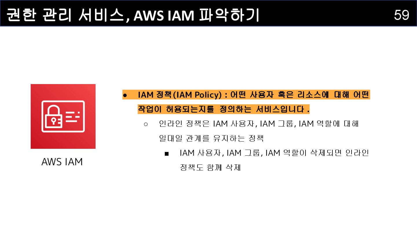 Policy) : 어떤 사용자 혹은 리소스에 대해 어떤 작업이 허용되는지를 정의하는 서비스입니다 . ◦ 인라인 정책은 IAM 사용자, IAM 그룹, IAM 역할에 대해 일대일 관계를 유지하는 정책 ▪ IAM 사용자, IAM 그룹, IAM 역할이 삭제되면 인라인 정책도 함께 삭제 AWS IAM