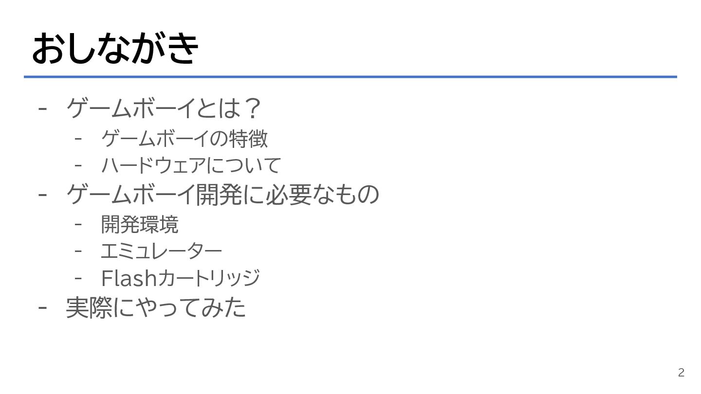 おしながき - ゲームボーイとは? - ゲームボーイの特徴 - ハードウェアについて - ゲームボーイ開発に必要なもの -
