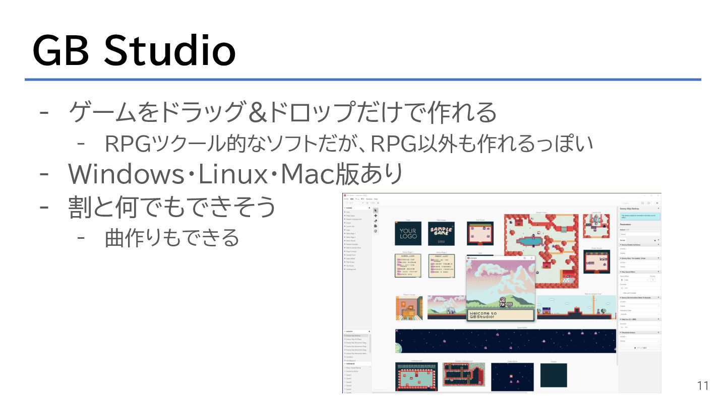 GB Studio - ゲームをドラッグ&ドロップだけで作れる - RPGツクール的なソフトだが、RPG以外も作れるっぽい - Windows・Linux・Mac版あり - 割と何でもできそう