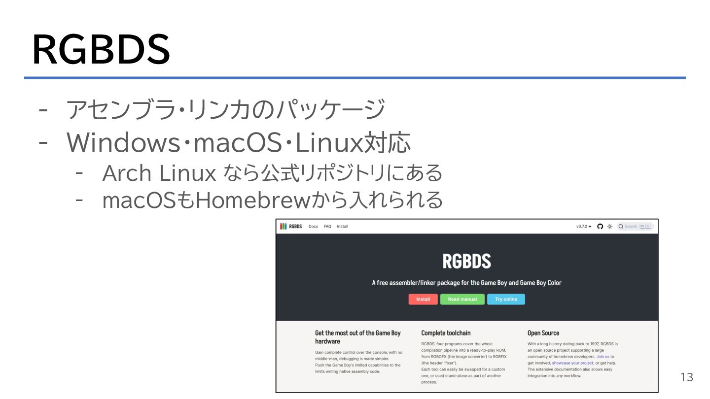 RGBDS - アセンブラ・リンカのパッケージ - Windows・macOS・Linux対応 - Arch Linux なら公式リポジトリにある -