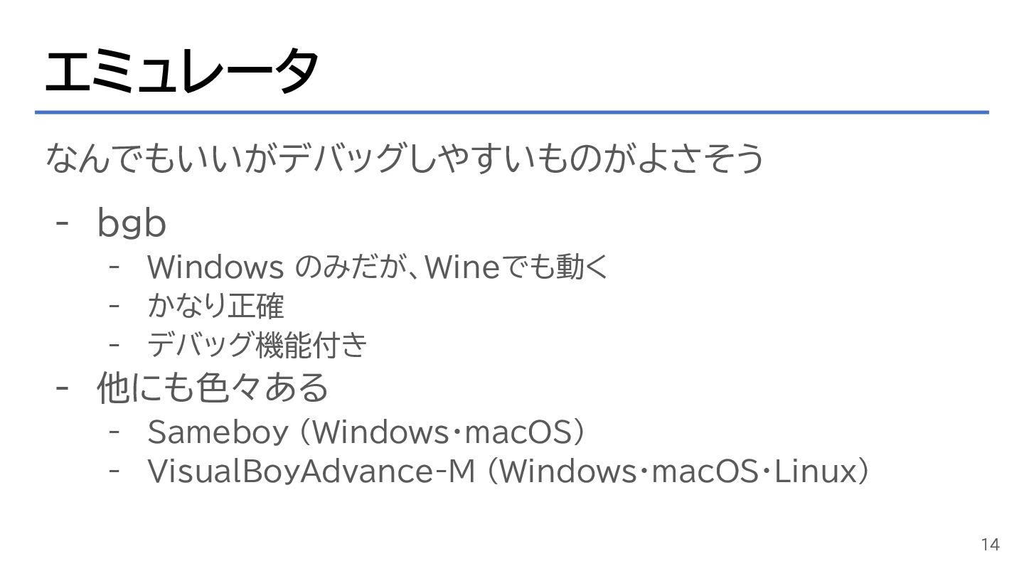エミュレータ なんでもいいがデバッグしやすいものがよさそう - bgb - Windows のみだが、Wineでも動く - かなり正確 -