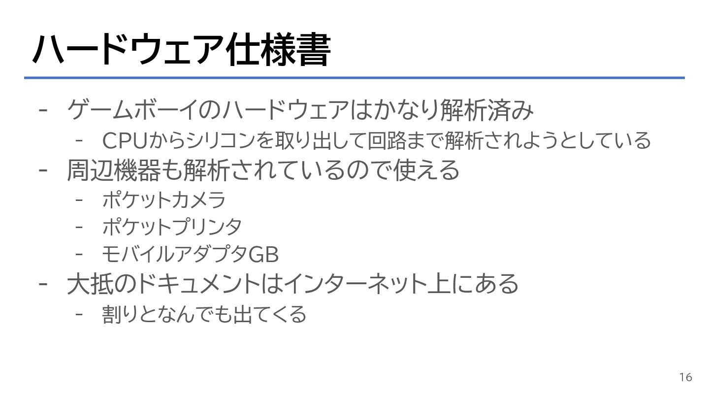 ハードウェア仕様書 - ゲームボーイのハードウェアはかなり解析済み - CPUからシリコンを取り出して回路まで解析されようとしている - 周辺機器も解析されているので使える - ポケットカメラ -