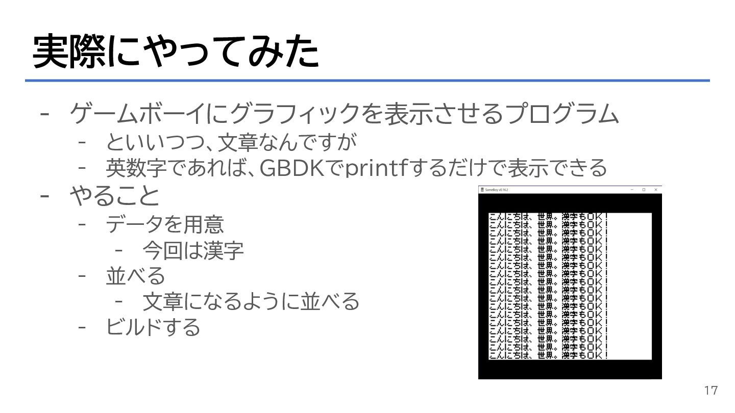 実際にやってみた - ゲームボーイにグラフィックを表示させるプログラム - といいつつ、文章なんですが - 英数字であれば、GBDKでprintfするだけで表示できる - やること -