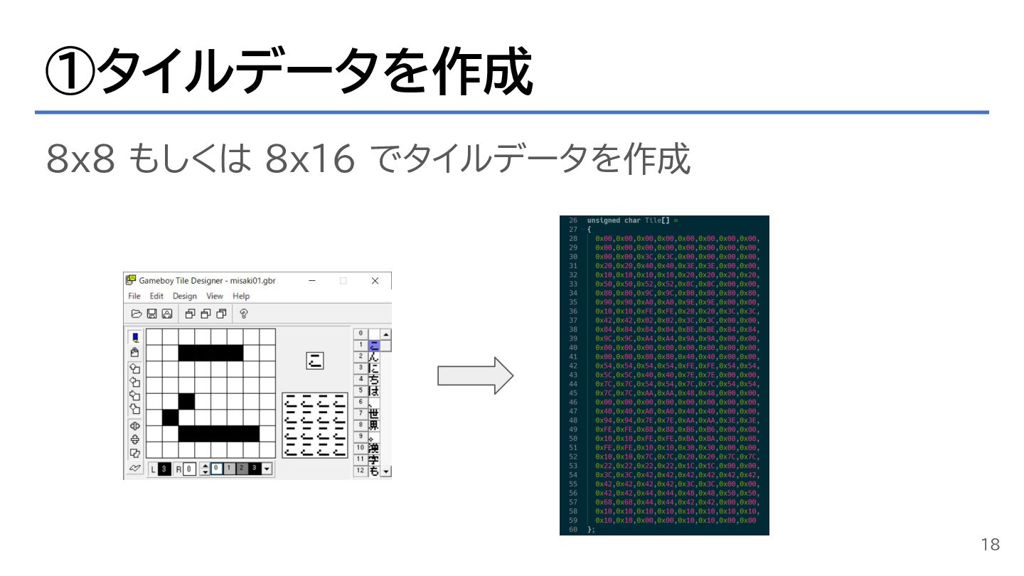 ①タイルデータを作成 8x8 もしくは 8x16 でタイルデータを作成 18