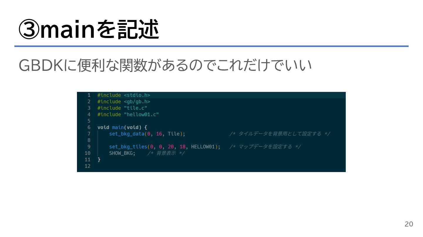 ③mainを記述 GBDKに便利な関数があるのでこれだけでいい 20