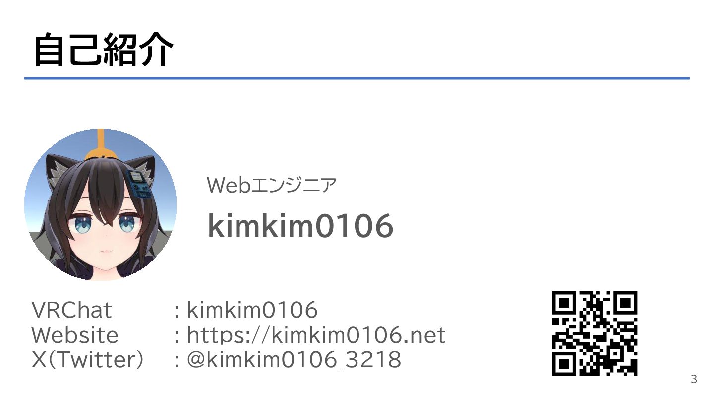 自己紹介 Webエンジニア kimkim0106 VRChat : kimkim0106 Website : https://kimkim0106.net X(Twitter)