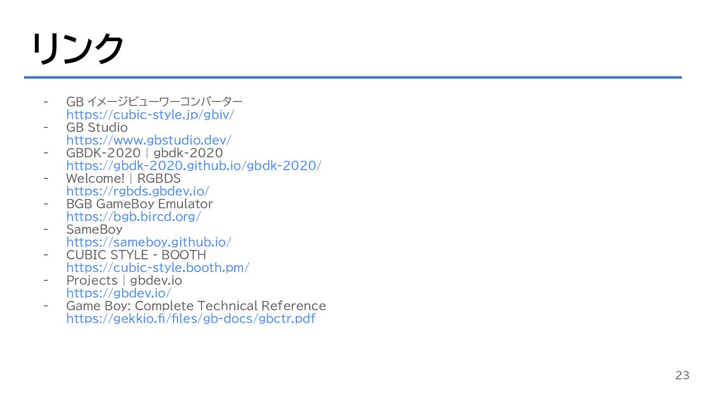 GBDK-2020 | gbdk-2020 https://gbdk-2020.github.io/gbdk-2020/ - Welcome! | RGBDS https://rgbds.gbdev.io/ - BGB GameBoy Emulator https://bgb.bircd.org/ - SameBoy https://sameboy.github.io/ - CUBIC STYLE - BOOTH https://cubic-style.booth.pm/ - Projects | gbdev.io https://gbdev.io/ - Game Boy: Complete Technical Reference https://gekkio.fi/files/gb-docs/gbctr.pdf 23