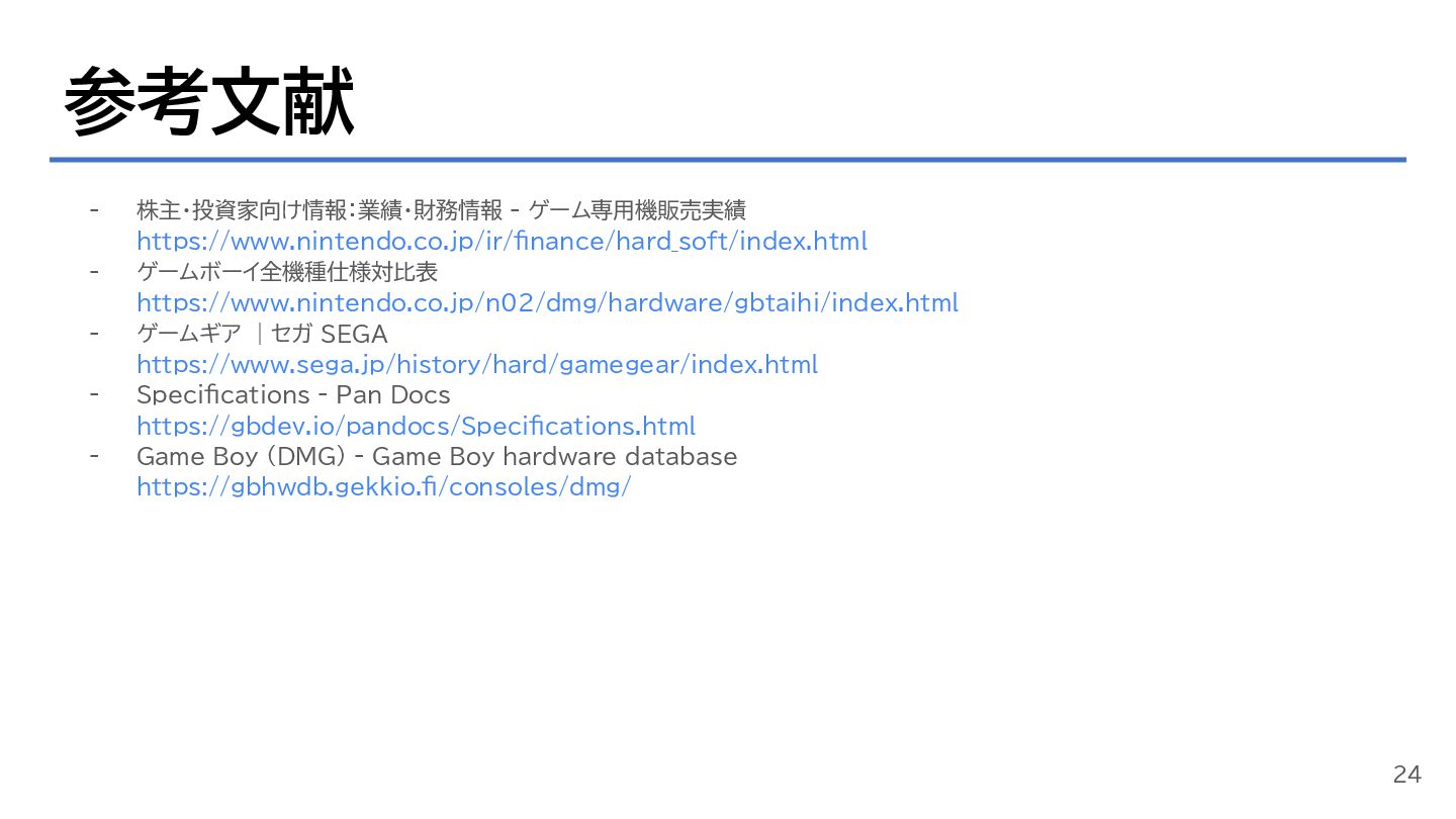 ゲームギア |セガ SEGA https://www.sega.jp/history/hard/gamegear/index.html - Specifications - Pan Docs https://gbdev.io/pandocs/Specifications.html - Game Boy (DMG) - Game Boy hardware database https://gbhwdb.gekkio.fi/consoles/dmg/ 24