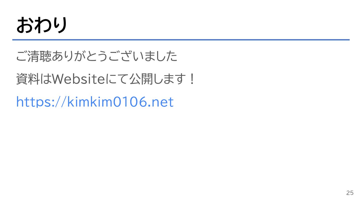 おわり ご清聴ありがとうございました 資料はWebsiteにて公開します! https://kimkim0106.net 25