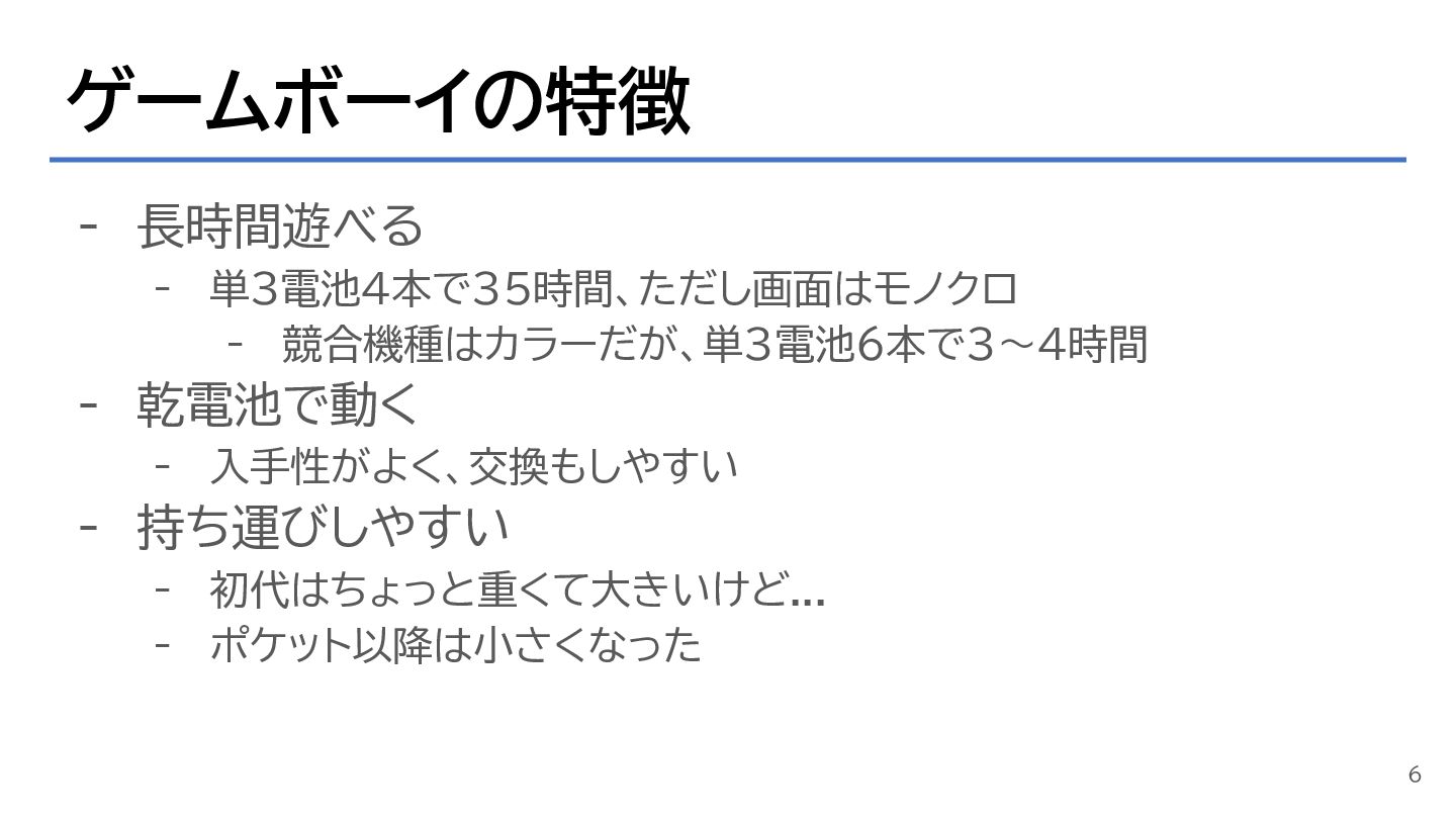 ゲームボーイの特徴 - 長時間遊べる - 単3電池4本で35時間、ただし画面はモノクロ - 競合機種はカラーだが、単3電池6本で3~4時間 - 乾電池で動く -