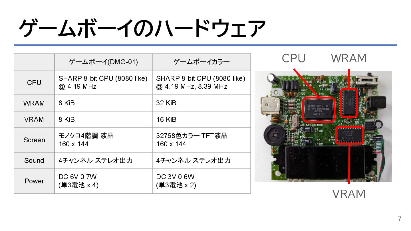 ゲームボーイのハードウェア 7 ゲームボーイ(DMG-01) ゲームボーイカラー CPU SHARP 8-bit CPU (8080 like)