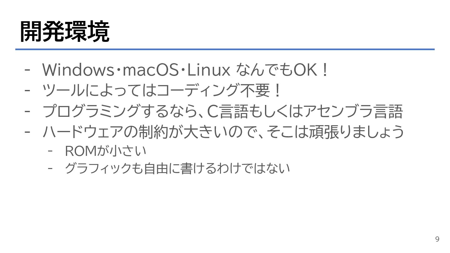 開発環境 - Windows・macOS・Linux なんでもOK! - ツールによってはコーディング不要! - プログラミングするなら、C言語もしくはアセンブラ言語 - ハードウェアの制約が大きいので、そこは頑張りましょう