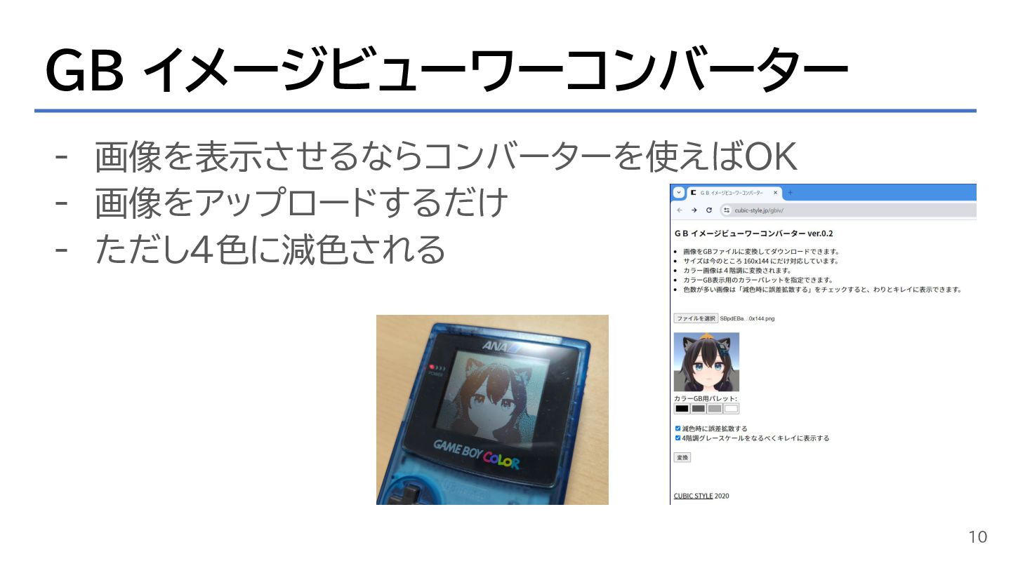 GB イメージビューワーコンバーター - 画像を表示させるならコンバーターを使えばOK - 画像をアップロードするだけ - ただし4色に減色される 10