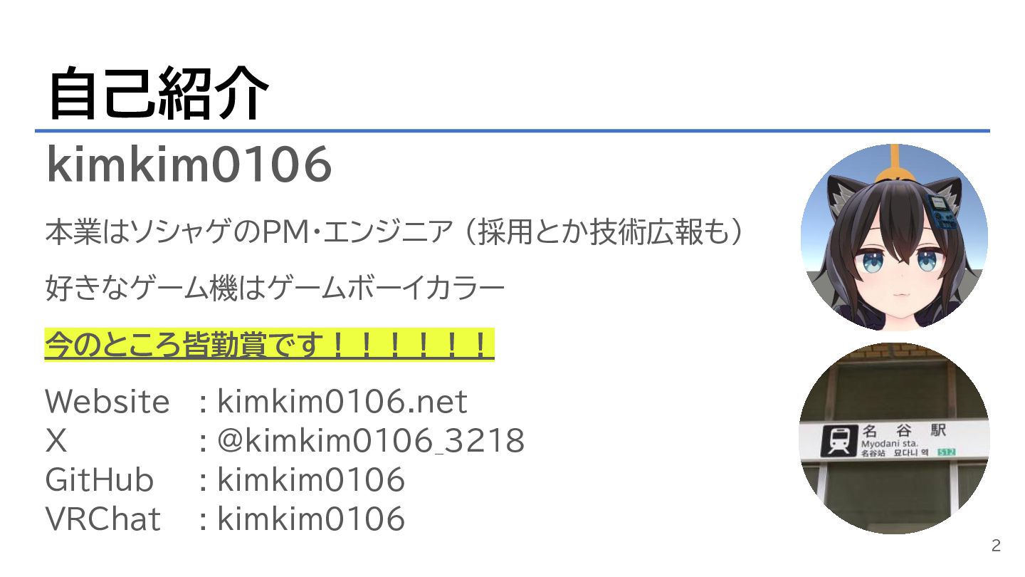 kimkim0106 本業はソシャゲのPM・エンジニア (採用とか技術広報も) 好きなゲーム機はゲームボーイカラー 今のところ皆勤賞です!!!!!! Website : kimkim0106.net X :