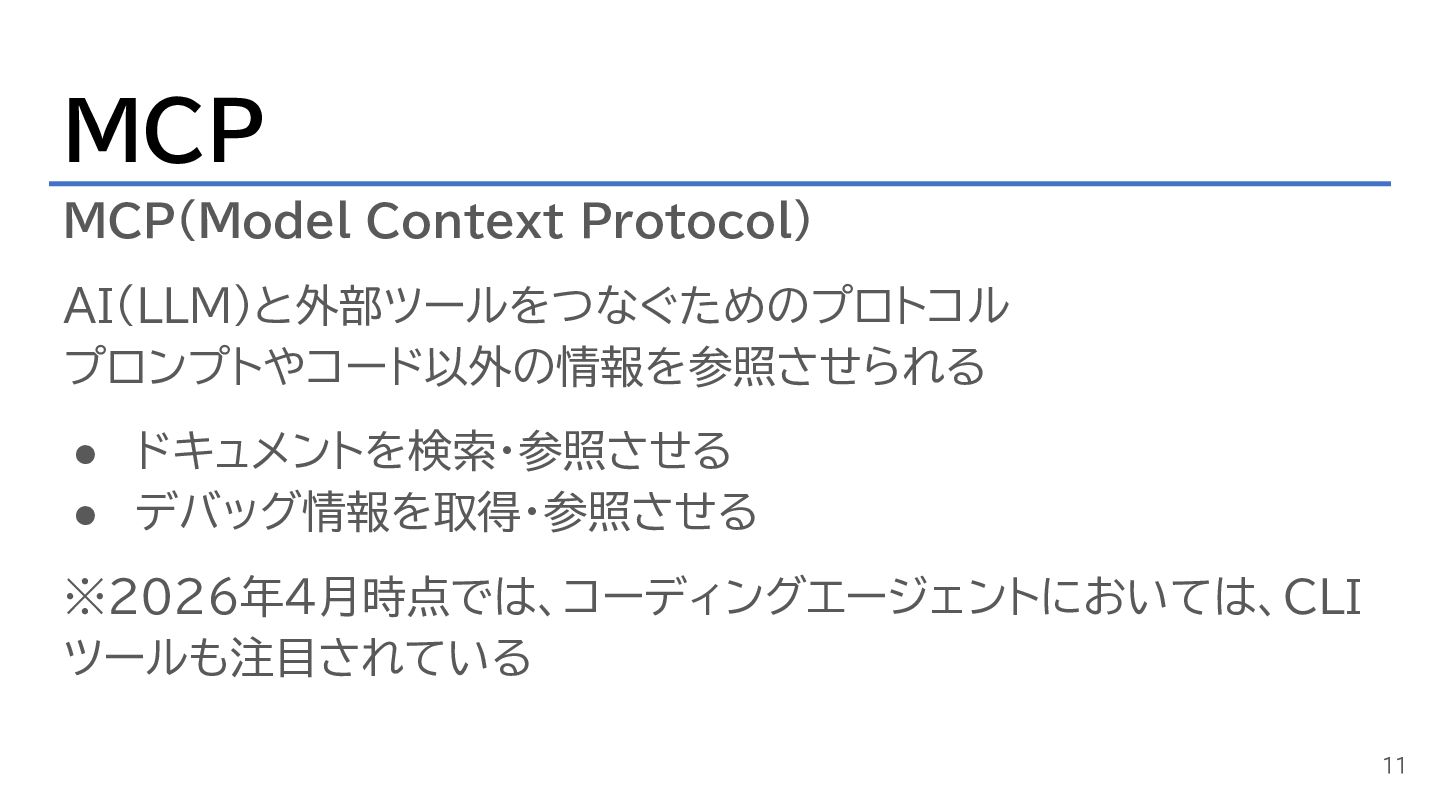 MCP(Model Context Protocol) AI(LLM)と外部ツールをつなぐためのプロトコル プロンプトやコード以外の情報を参照させられる • ドキュメントを検索・参照させる • デバッグ情報を取得・参照させる ※2026年4月時点では、コーディングエージェントにおいては、CLI