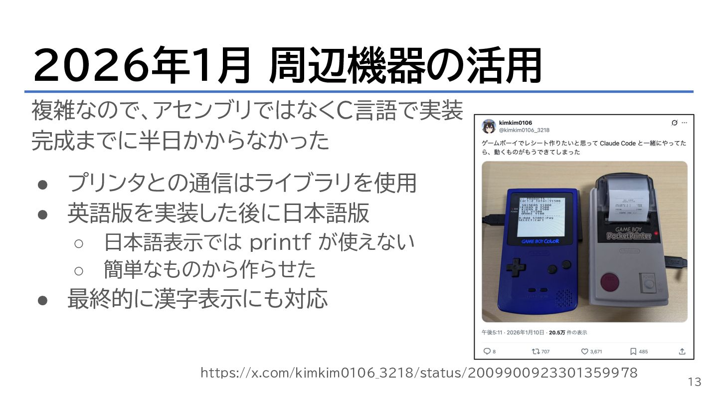 ◦ 簡単なものから作らせた • 最終的に漢字表示にも対応 2026年1月 周辺機器の活用 13 https://x.com/kimkim0106_3218/status/2009900923301359978