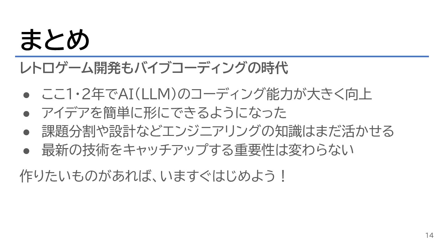 レトロゲーム開発もバイブコーディングの時代 • ここ1・2年でAI(LLM)のコーディング能力が大きく向上 • アイデアを簡単に形にできるようになった • 課題分割や設計などエンジニアリングの知識はまだ活かせる • 最新の技術をキャッチアップする重要性は変わらない 作りたいものがあれば、いますぐはじめよう!