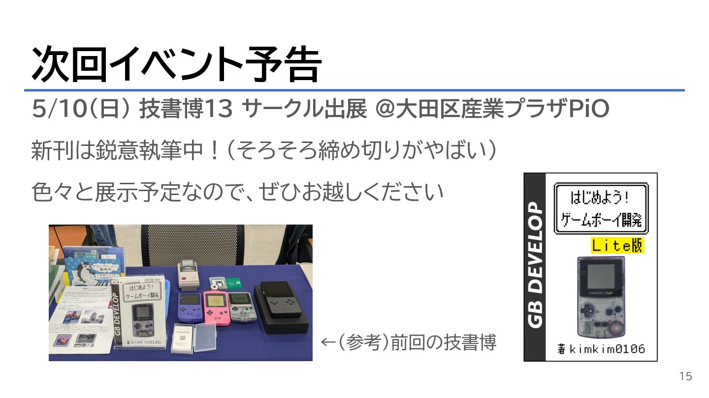 次回イベント予告 5/10(日) 技書博13 サークル出展 @大田区産業プラザPiO 新刊は鋭意執筆中!(そろそろ締め切りがやばい) 色々と展示予定なので、ぜひお越しください 15 ←(参考)前回の技書博