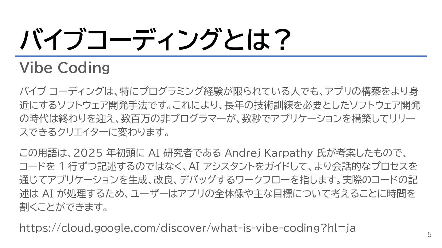 年初頭に AI 研究者である Andrej Karpathy 氏が考案したもので、 コードを 1 行ずつ記述するのではなく、AI アシスタントをガイドして、より会話的なプロセスを 通じてアプリケーションを生成、改良、デバッグするワークフローを指します。実際のコードの記 述は AI が処理するため、ユーザーはアプリの全体像や主な目標について考えることに時間を 割くことができます。 https://cloud.google.com/discover/what-is-vibe-coding?hl=ja