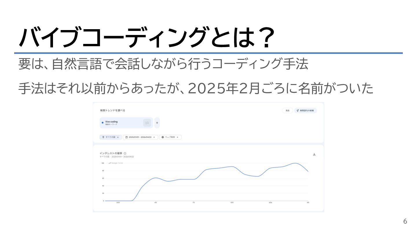 要は、自然言語で会話しながら行うコーディング手法 手法はそれ以前からあったが、2025年2月ごろに名前がついた バイブコーディングとは? 6