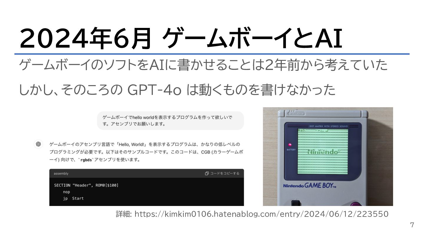 ゲームボーイのソフトをAIに書かせることは2年前から考えていた しかし、そのころの GPT-4o は動くものを書けなかった 2024年6月 ゲームボーイとAI 7 詳細: https://kimkim0106.hatenablog.com/entry/2024/06/12/223550