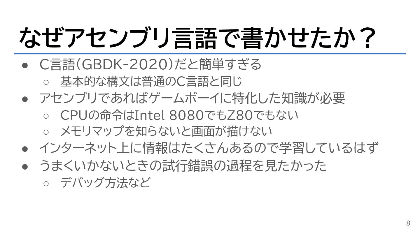 • C言語(GBDK-2020)だと簡単すぎる ◦ 基本的な構文は普通のC言語と同じ • アセンブリであればゲームボーイに特化した知識が必要 ◦ CPUの命令はIntel 8080でもZ80でもない ◦