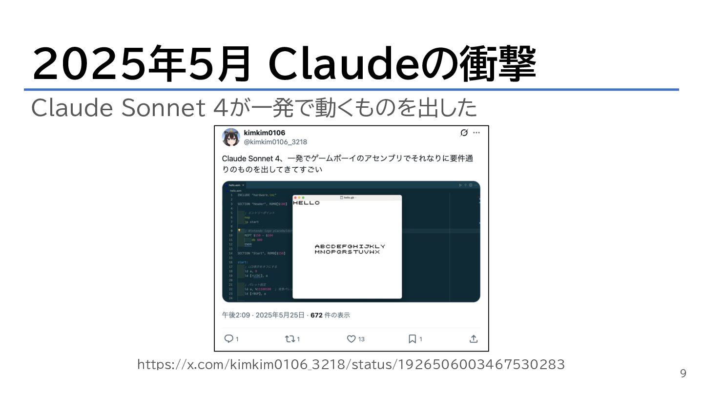 Claude Sonnet 4が一発で動くものを出した 2025年5月 Claudeの衝撃 9 https://x.com/kimkim0106_3218/status/1926506003467530283