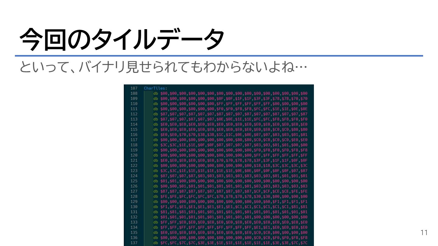 今回のタイルデータ といって、バイナリ見せられてもわからないよね… 11