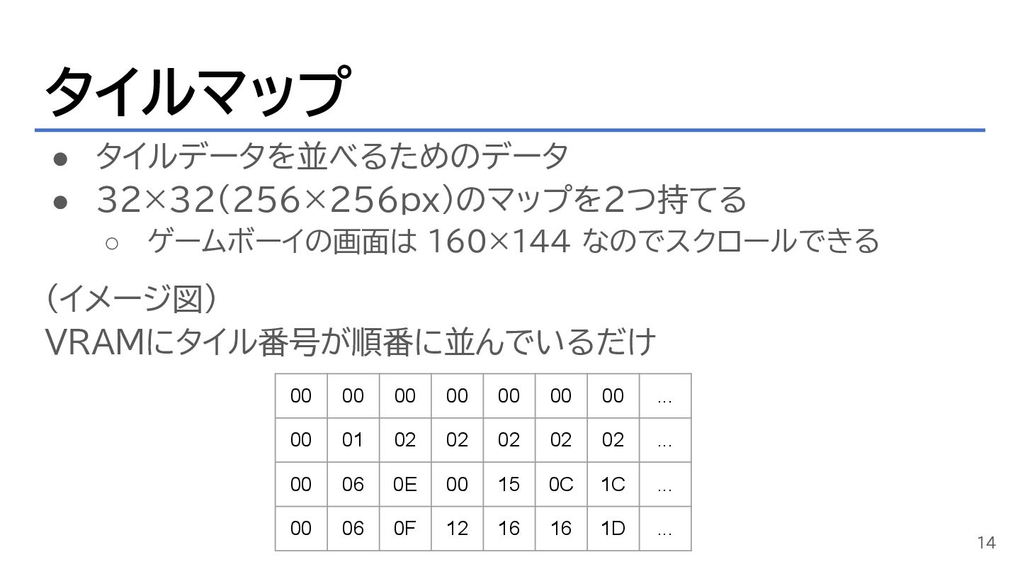 • 一気に書き換える場合は画面を暗転させたりする • 実は書き換えには色々とテクニックはあり… ◦ 描画途中にタイルを書き換えることができる ◦ タイミングが限られるので割り込みとかを使ってやっているっぽい 13
