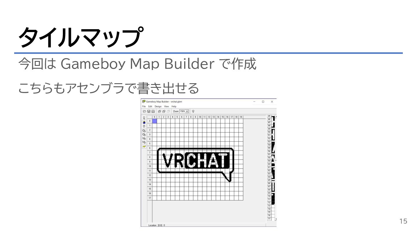 タイルマップ 今回は Gameboy Map Builder で作成 こちらもアセンブラで書き出せる 15