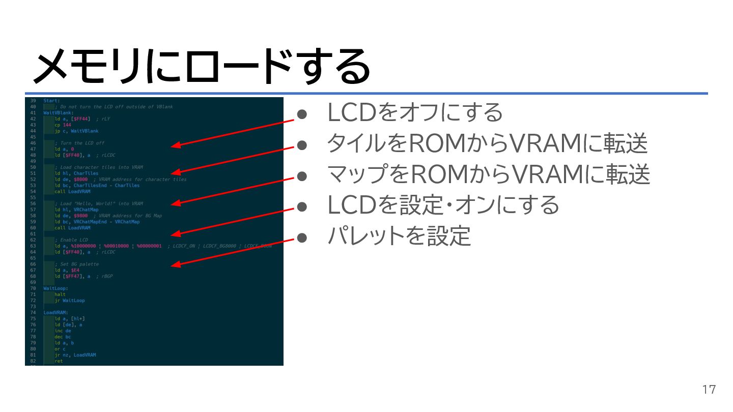メモリにロードする • LCDをオフにする • タイルをROMからVRAMに転送 • マップをROMからVRAMに転送 • LCDを設定・オンにする •
